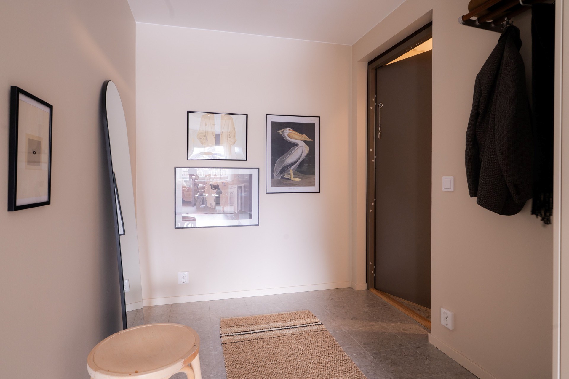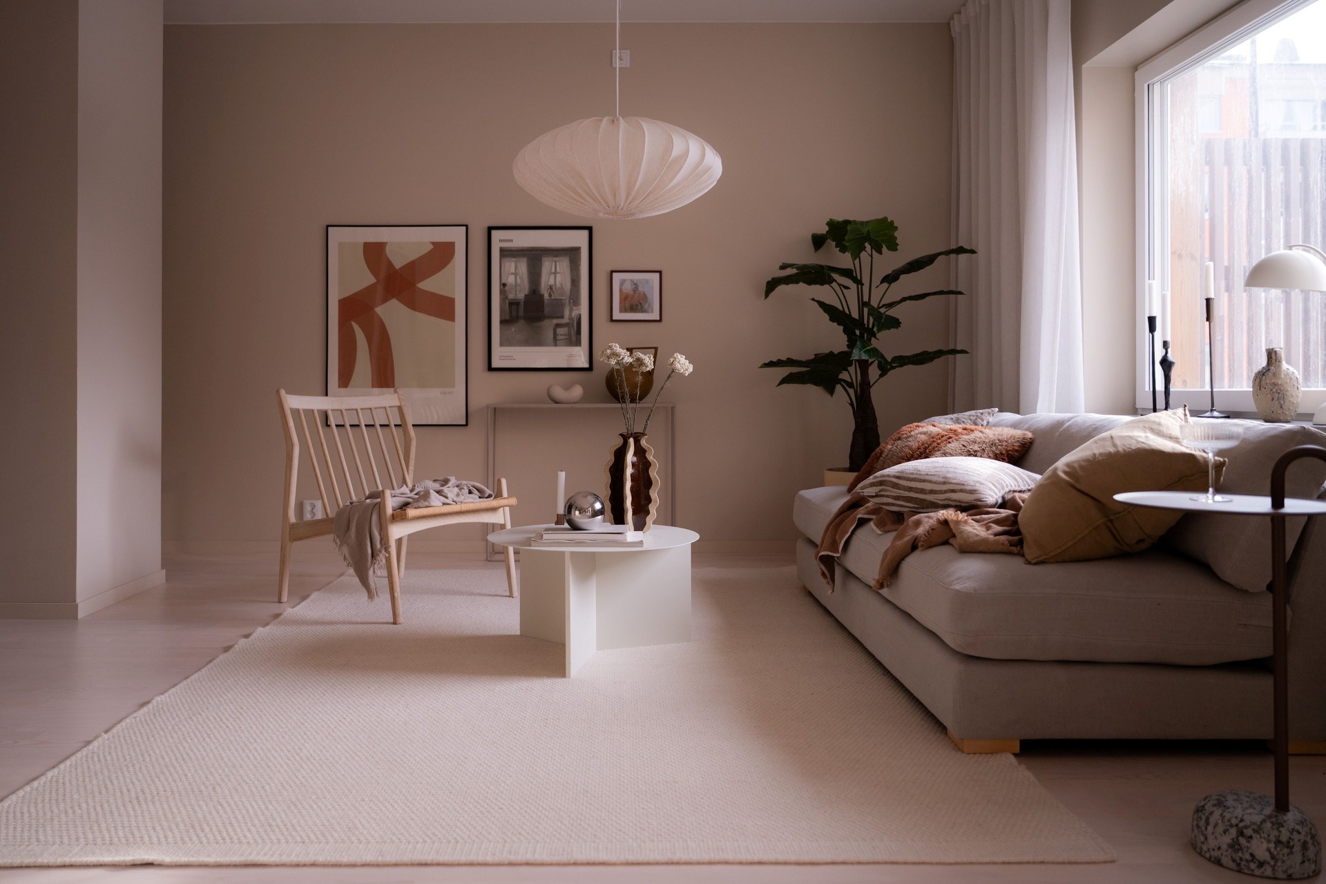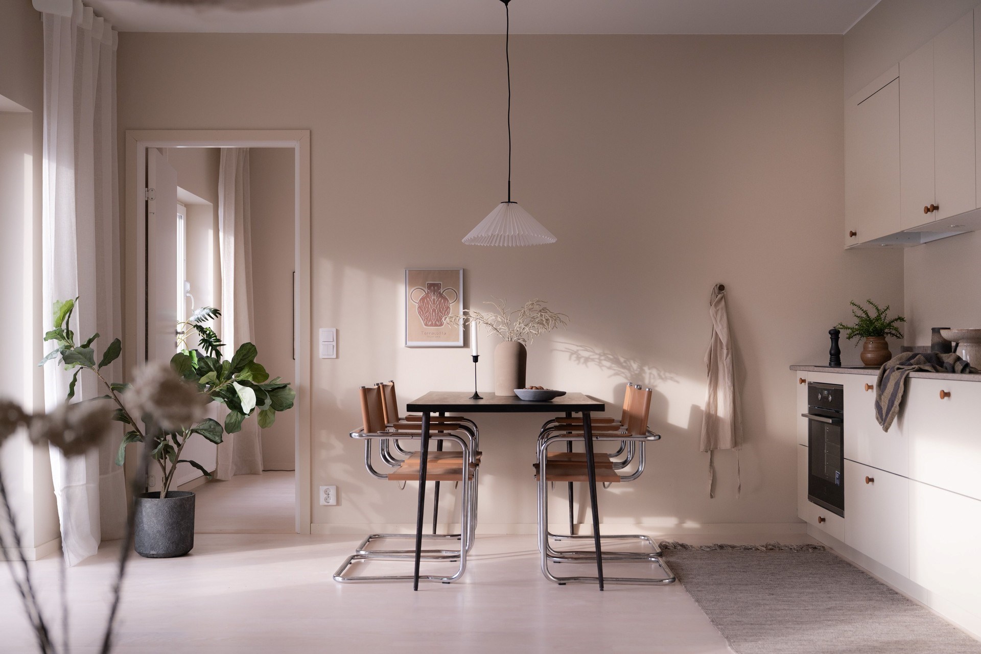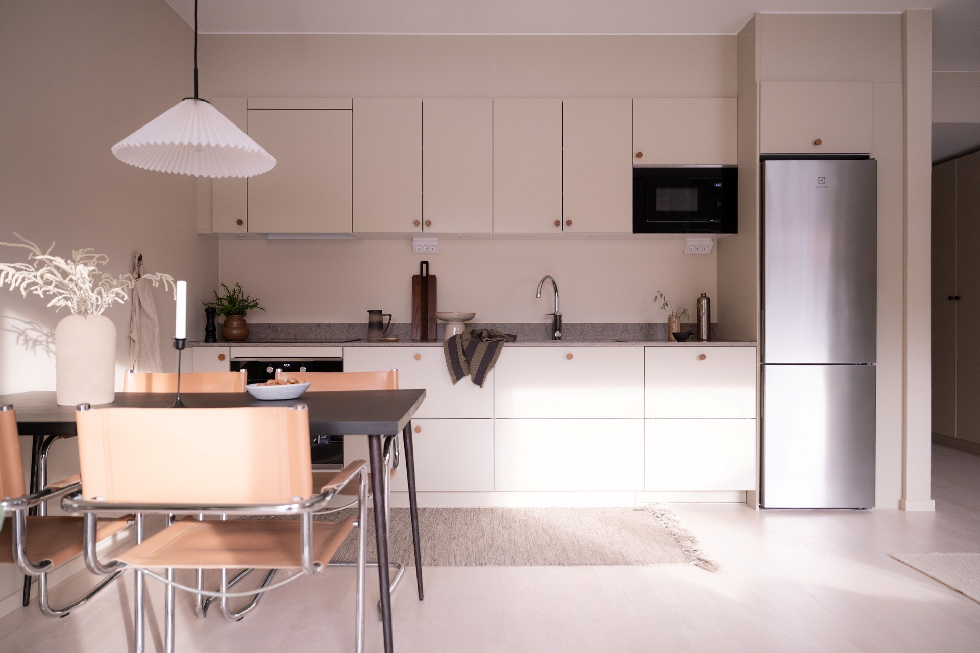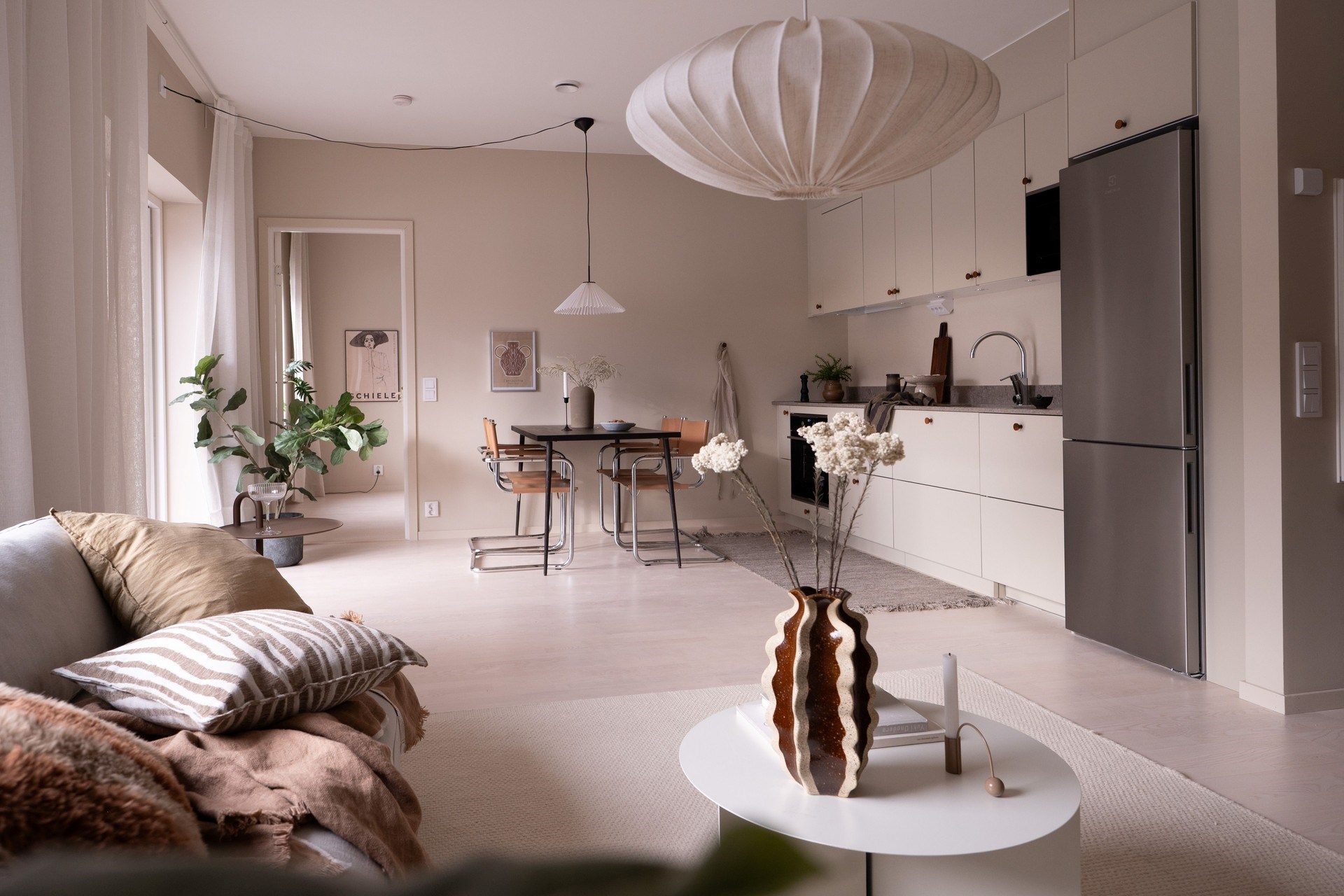 Bostadens inredningskoncept håller hög standard och flörtar med nutida trender och naturnära toner. Köket från Ballingslöv har ostronbeigea luckor, knoppar i valnöt och arbetsbänk i kompositsten som även fortsätter upp som bakkantslist. Samma jordnära toner kommer igen i badrummets beige/grå klinker och väggarnas matta beige kakelplattor. Badrummet har även spotlights och en sandfärgad kommod med valnötsknopp som även förekommer på väggskåpen vid tvättdelen i samma toner som kommoden. Vid entrén ligger ett beige klinkergolv som övergår i en askparkett som tillsammans med sandfärgade väggar utgör basen i övriga rum i bostaden.