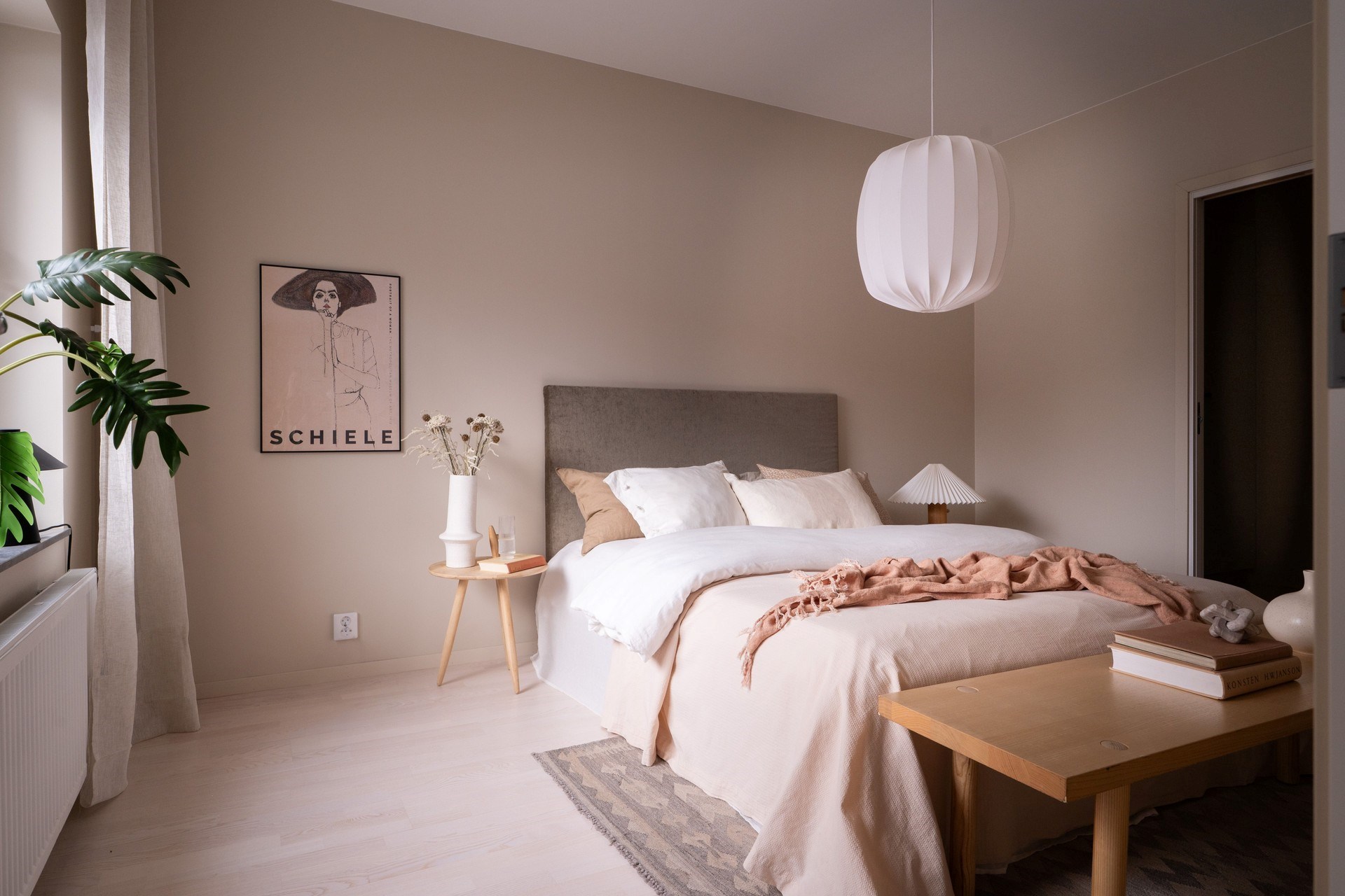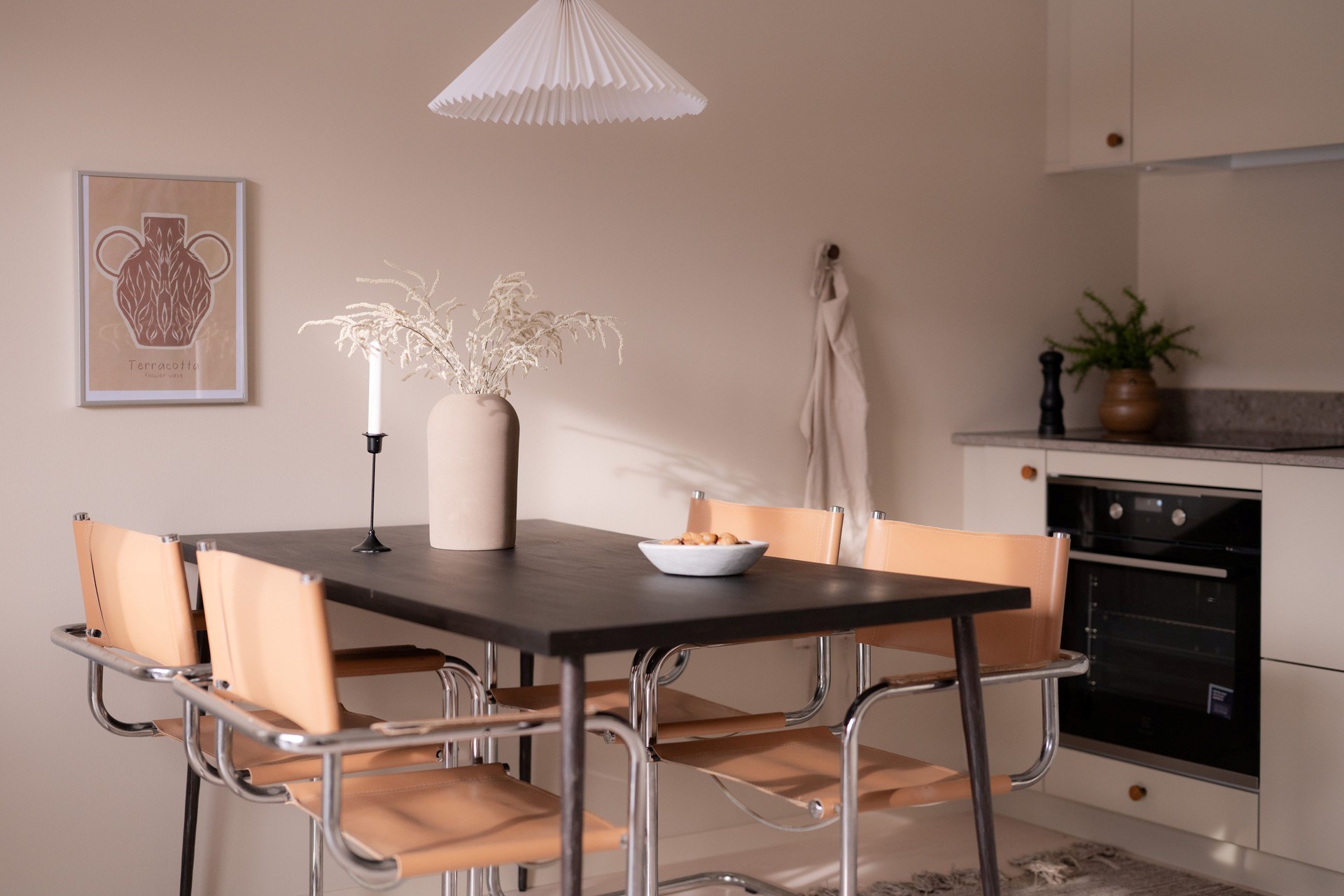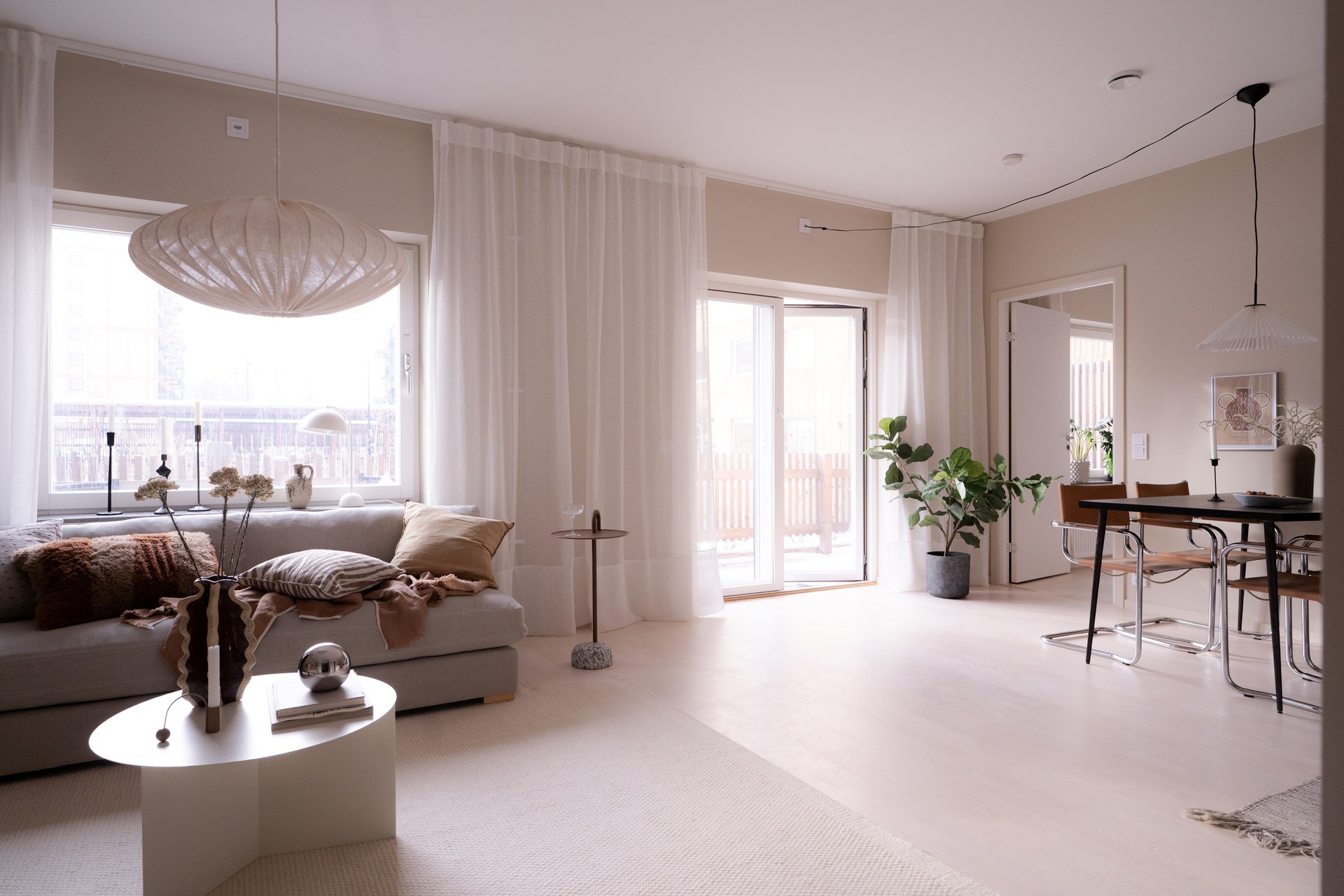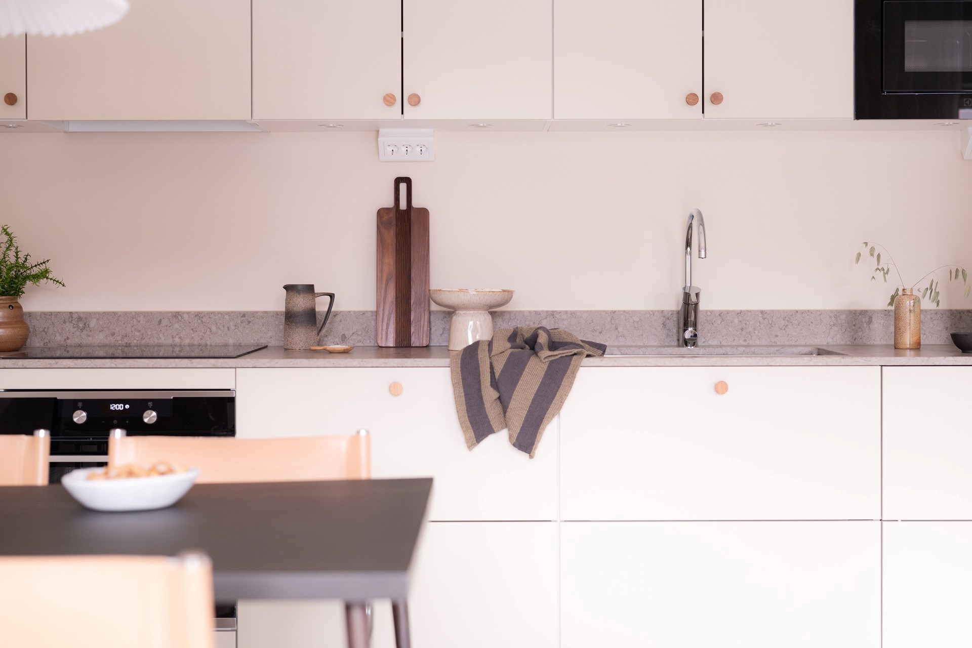 Bostadens inredningskoncept håller hög standard och flörtar med nutida trender och naturnära toner. Köket från Ballingslöv har ostronbeigea luckor, knoppar i valnöt och arbetsbänk i kompositsten som även fortsätter upp som bakkantslist. Samma jordnära toner kommer igen i badrummets beige/grå klinker och väggarnas matta beige kakelplattor. Badrummet har även spotlights och en sandfärgad kommod med valnötsknopp som även förekommer på väggskåpen vid tvättdelen i samma toner som kommoden. Vid entrén ligger ett beige klinkergolv som övergår i en askparkett som tillsammans med sandfärgade väggar utgör basen i övriga rum i bostaden.