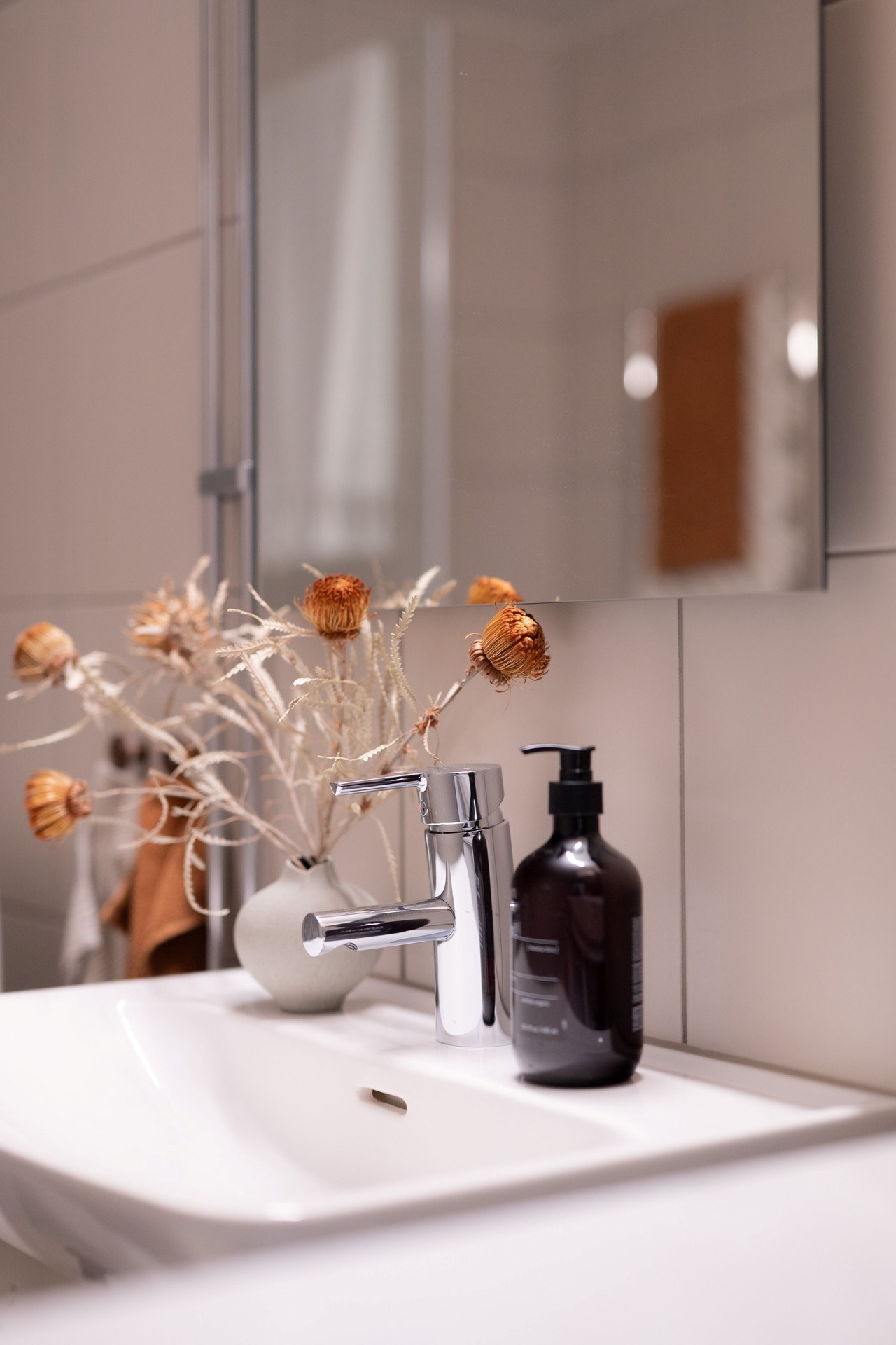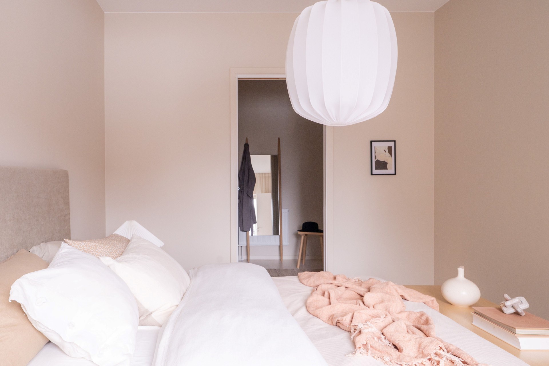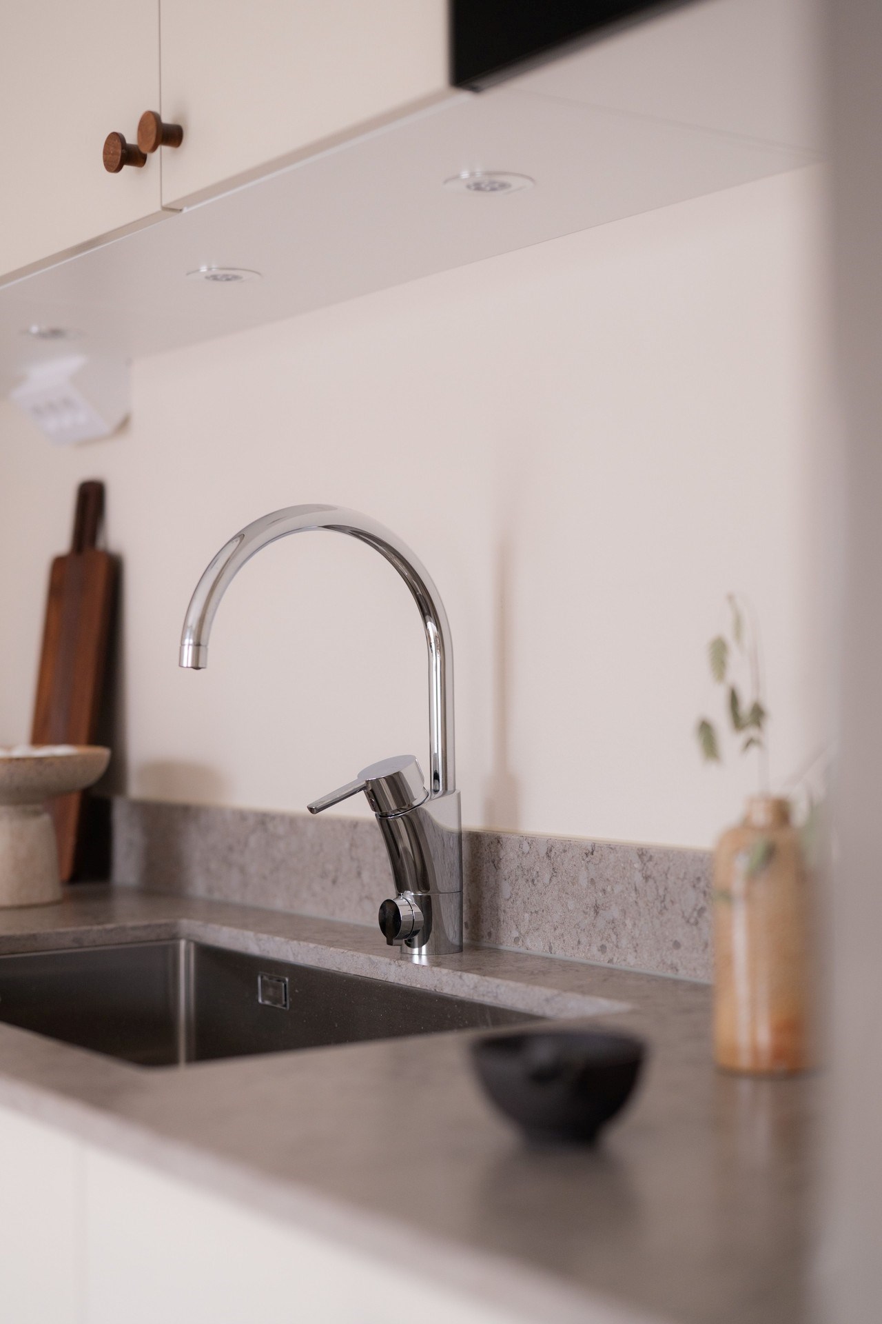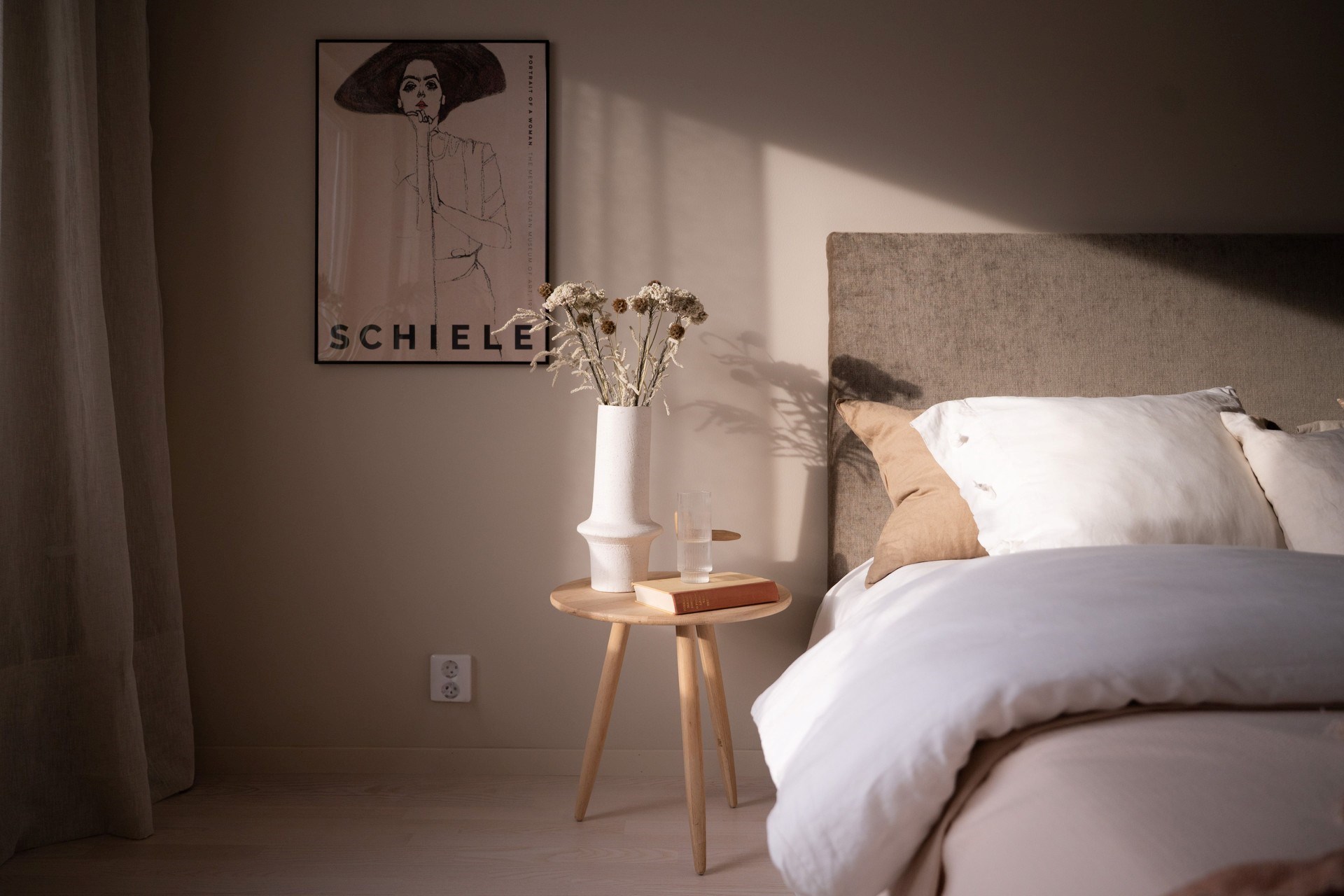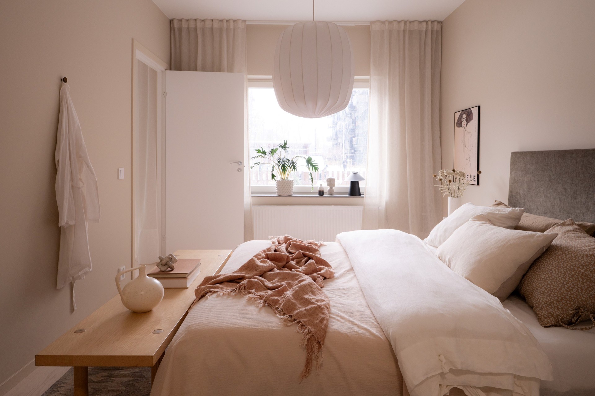 Bostadens inredningskoncept håller hög standard och flörtar med nutida trender och naturnära toner. Köket från Ballingslöv har ostronbeigea luckor, knoppar i valnöt och arbetsbänk i kompositsten som även fortsätter upp som bakkantslist. Samma jordnära toner kommer igen i badrummets beige/grå klinker och väggarnas matta beige kakelplattor. Badrummet har även spotlights och en sandfärgad kommod med valnötsknopp som även förekommer på väggskåpen vid tvättdelen i samma toner som kommoden. Vid entrén ligger ett beige klinkergolv som övergår i en askparkett som tillsammans med sandfärgade väggar utgör basen i övriga rum i bostaden.