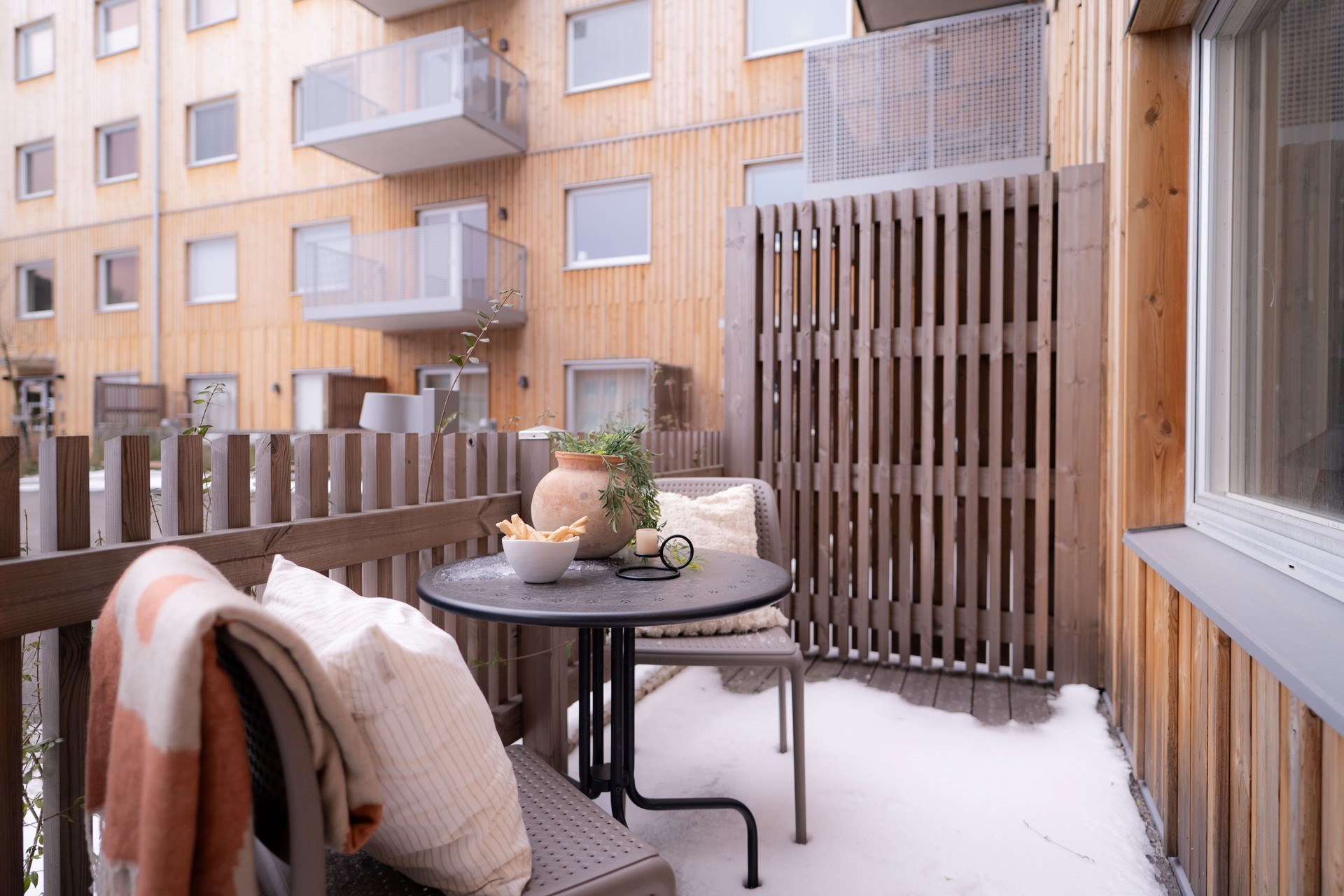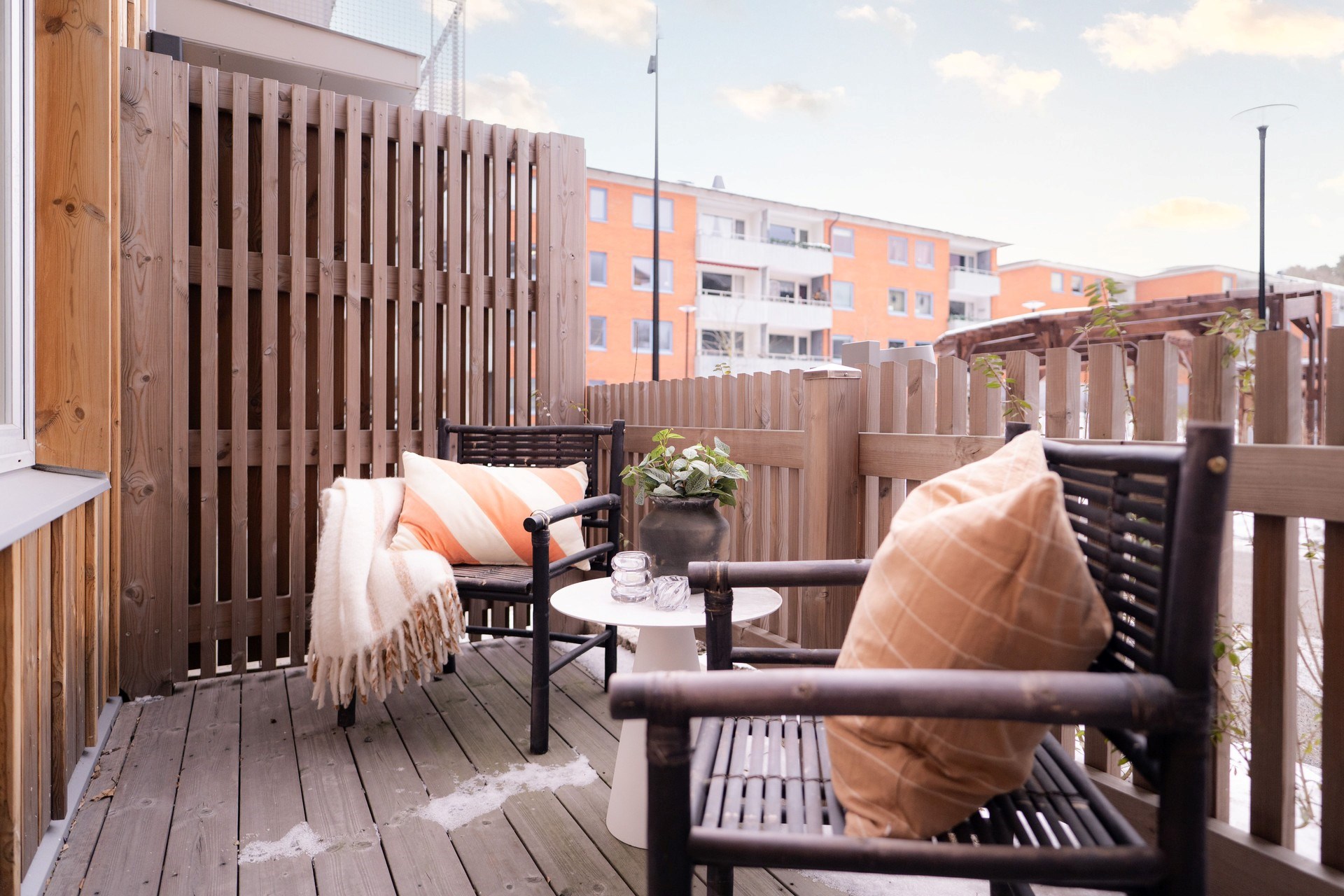 Trevlig tvårumslägenhet med rymlig uteplats i söder som nås via pardörrar från kök och vardagsrum, som ligger i ett öppet samband. Köket är fullutrustat och rummet får ett trevligt ljus från fönsterpartierna. Sovrummet är rymligt och en egen klädkammare om dryga fem kvm är riktigt lyxigt! Badrummet är utrustat med både tvättmaskin och torktumlare med ovanliggande arbetsbänk som underlättar i vardagen.