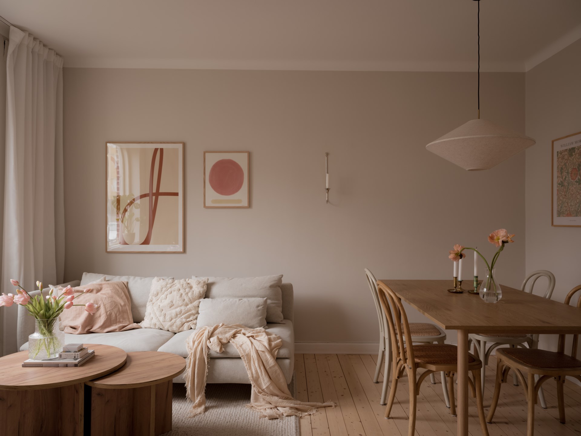 Planlösningen är både genomtänkt och väldisponerad. De sociala ytorna samspelar naturligt och bjuder in till umgänge, medan den privata delen ligger mer avskilt, med sovrummet placerat innanför vackra pardörrar som ger bostaden både karaktär och lugn. Här finns en tydlig uppdelning mellan vardag och vila, utan att kompromissa med rymd eller flöde av ljus.