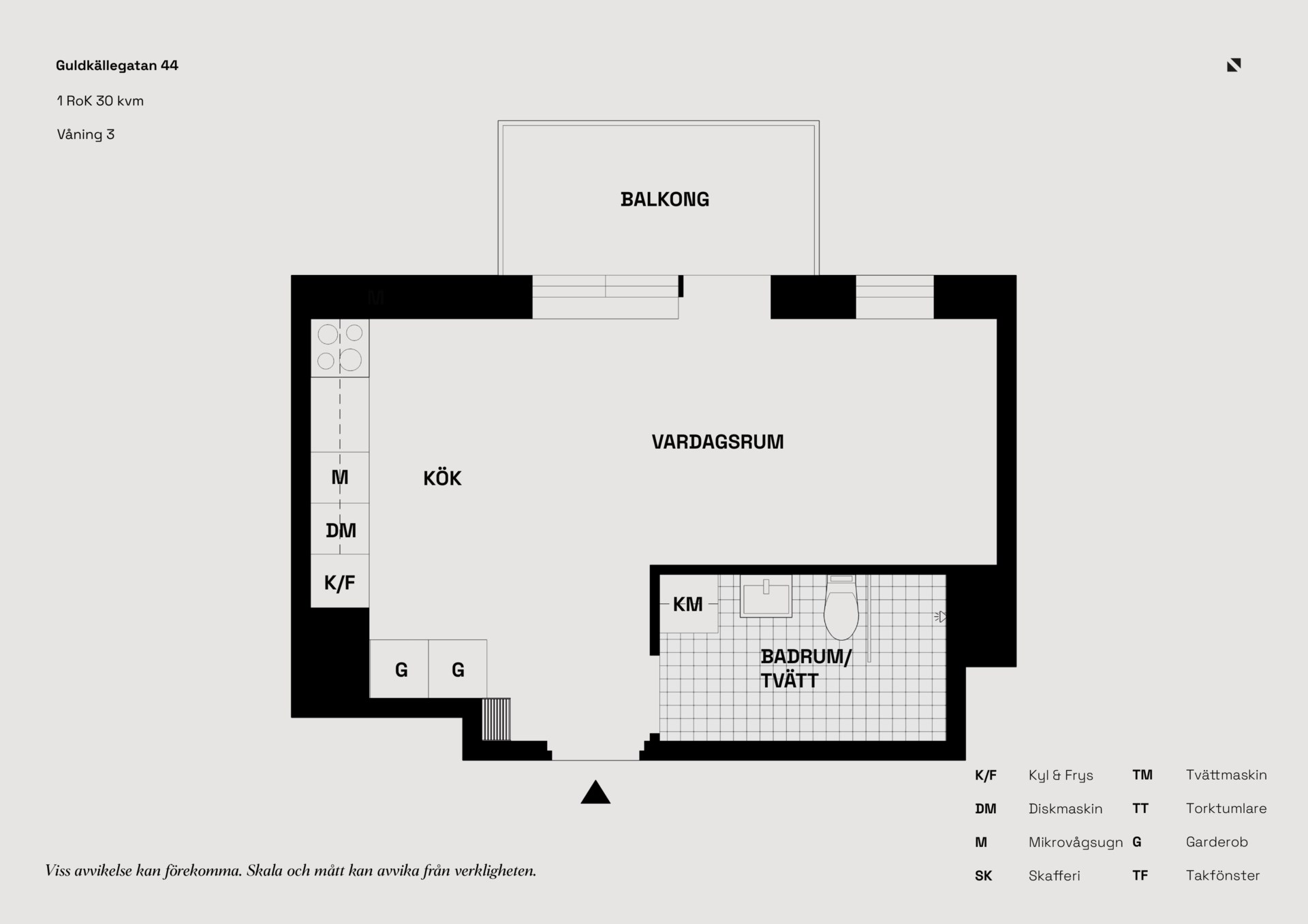 I den öppna och sociala planlösningen mellan kök och allrummet finns plats för både matbord, soffgrupp och säng med tillhörande möblemang. Det helkaklade badrummet är utrustat med en kombinerad tvättmaskin och torktumlare, vilket ger extra bekvämlighet och effektivitet i vardagen.