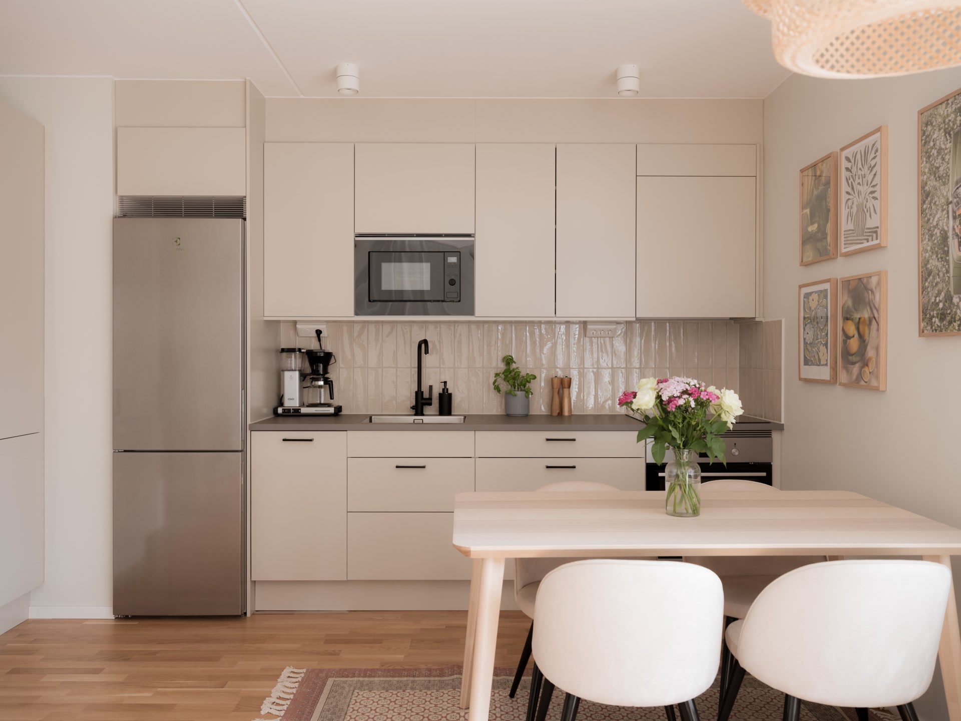 Denna välplanerade etta erbjuder smarta ytor med praktiska funktioner och en ljuvlig balkong vett åt ett soligt västerläge mot den fina innergården. Varje detalj är noggrant genomtänkt för att skapa en harmonisk atmosfär. Det erbjuds låga fönsterbröstningar som skapar ljus och varma kulörer på både väggar och golv som ger en inbjudande och stilren bas. Köket från Marbodal har en behaglig beige färgsättning med en mörkare bänkskiva och matchande beige kakel som ger en stilfull touch. Handtagen är lyxigt svarta och maskinparken är av högsta kvalitet!