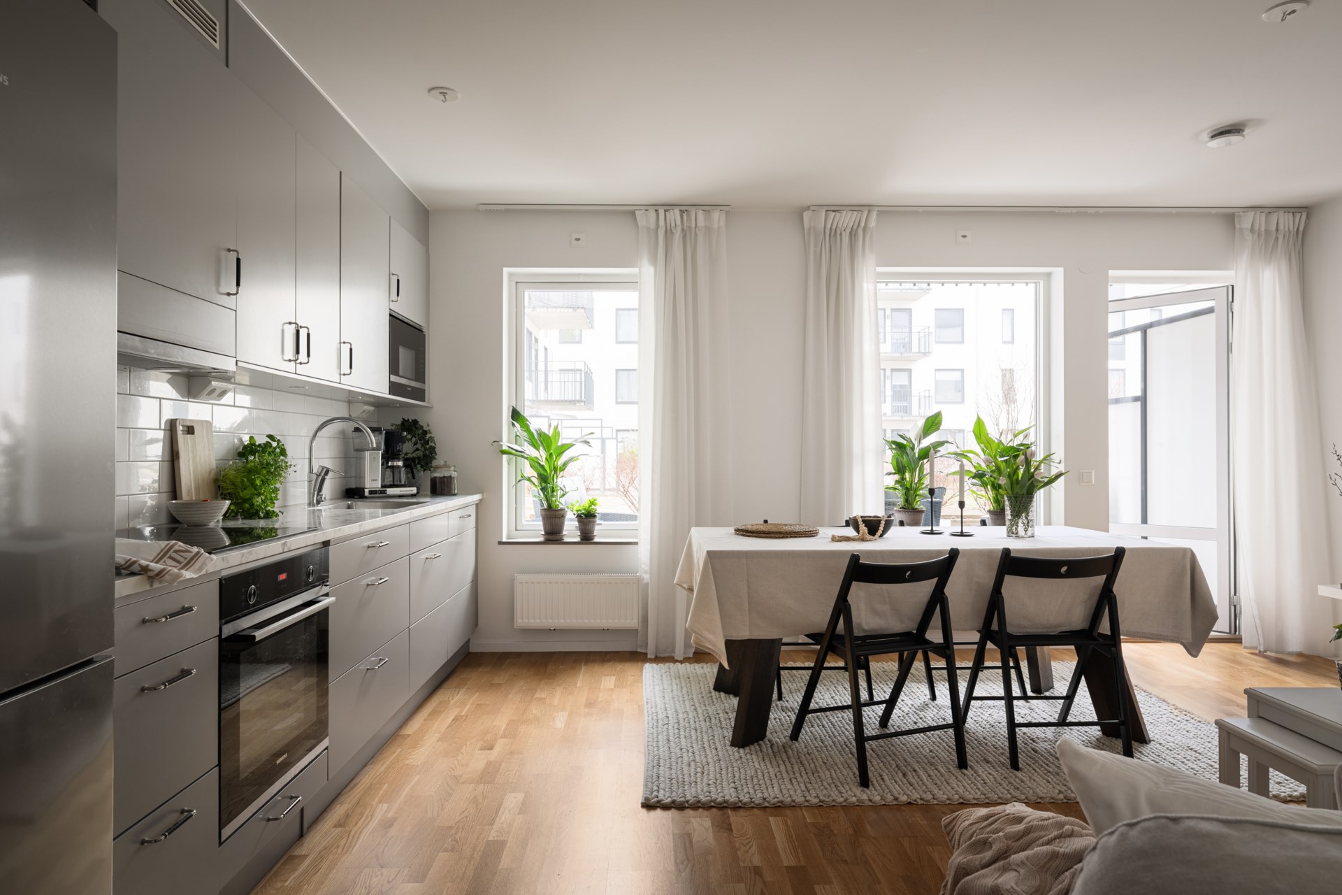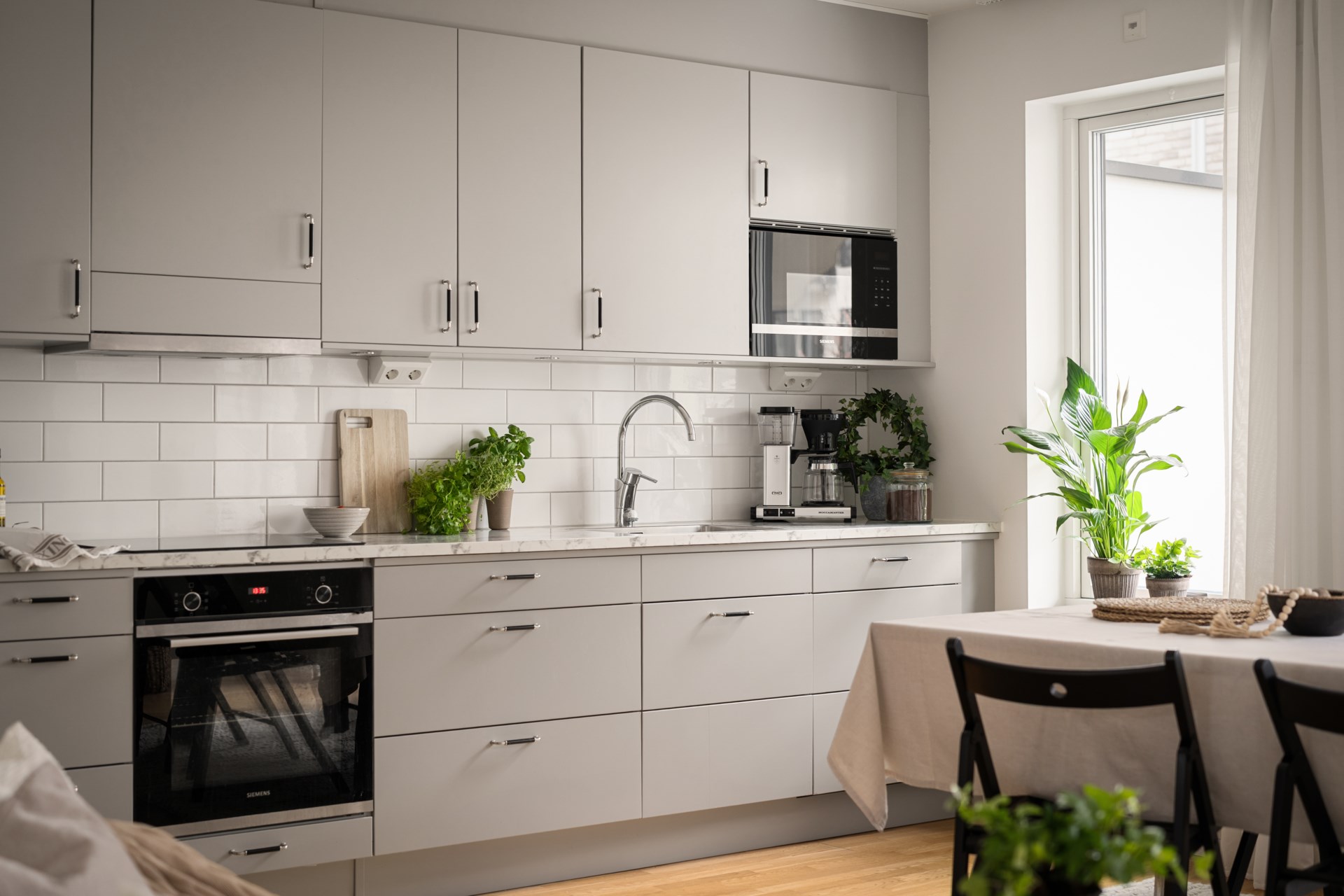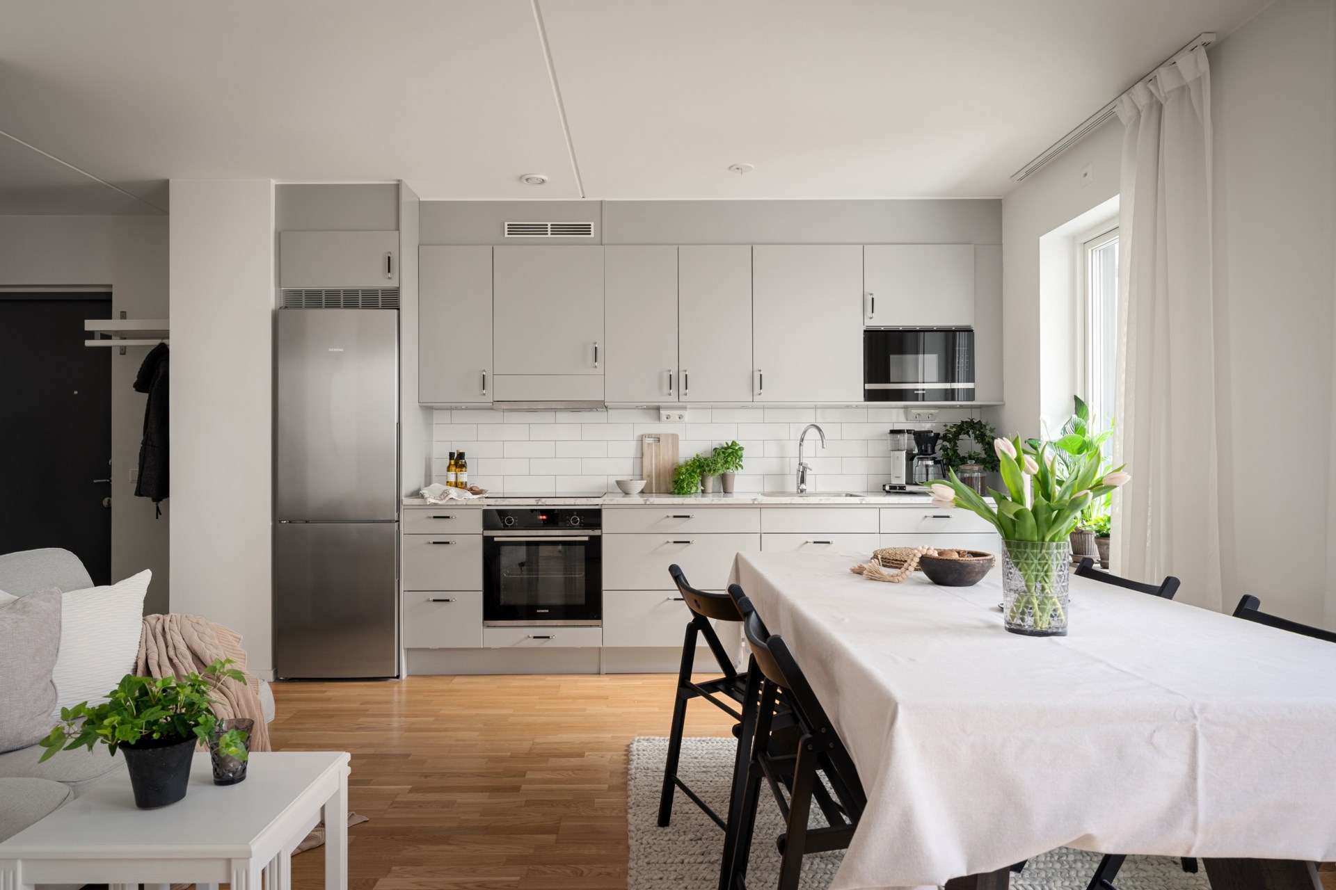 Ett hem med stilrena materialval och en social planlösning där det öppna köket möter vardagsrumsdelen på bästa sätt. Här bor du fräscht och bekvämt med härligt ljusinsläpp, fina ytor för både soffgrupp och matplats samt ett kök som bjuder in till matlagning och umgänge. Den kompletta maskinparken och de generösa arbetsytorna gör vardagen smidig, oavsett om du lagar vardagsmiddag eller dukar upp för vänner.