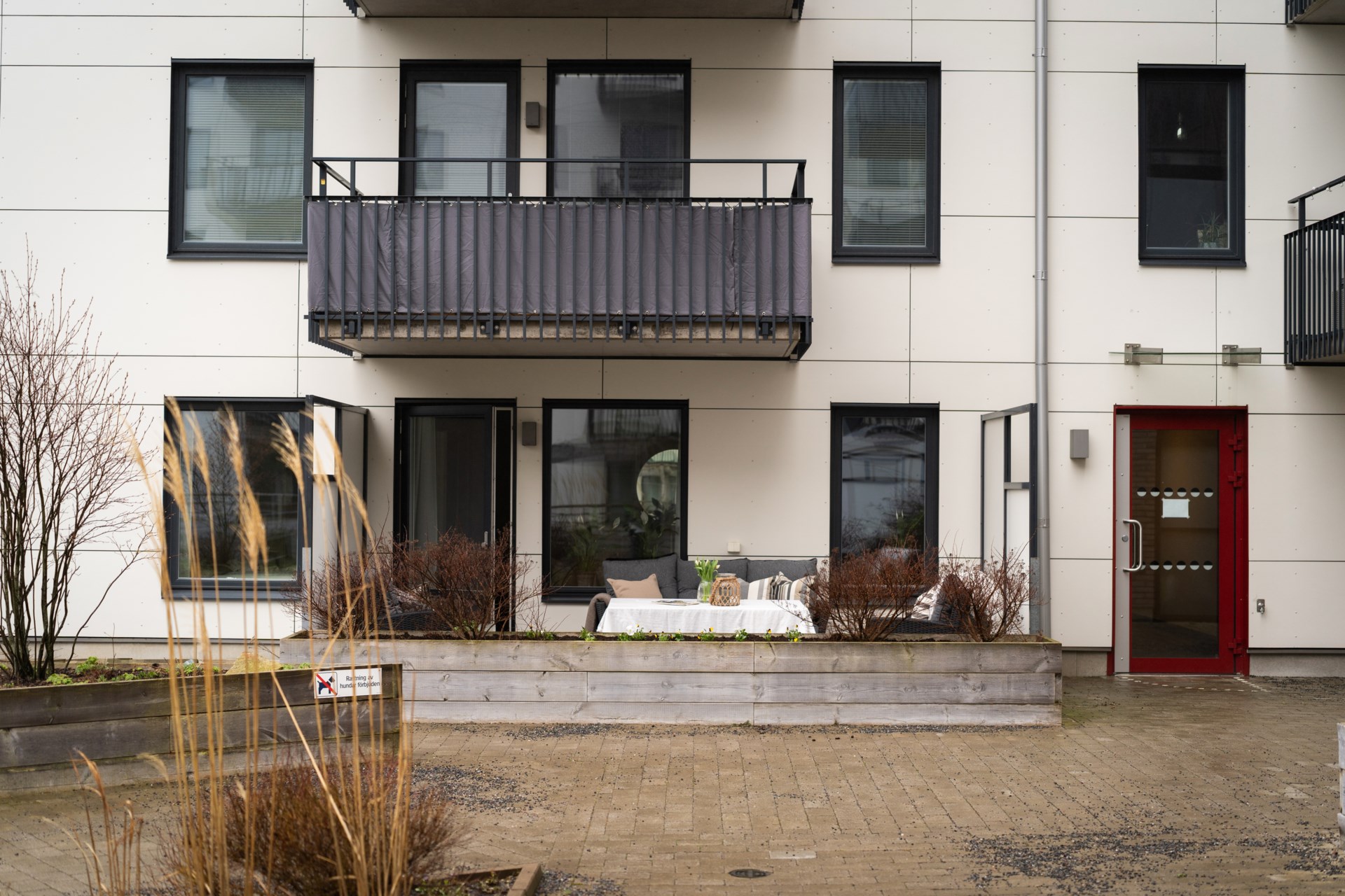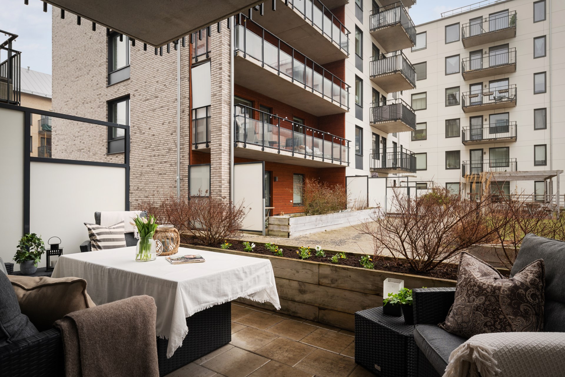 En av bostadens stora höjdpunkter är uteplatsen mot den trevliga innergården, en naturlig förlängning av vardagsrummet och en given favoritplats under sommarhalvåret. Här finns gott om plats för utemöbler och grill, perfekt för morgonkaffet, lata eftermiddagar och långa kvällar i goda vänners lag.