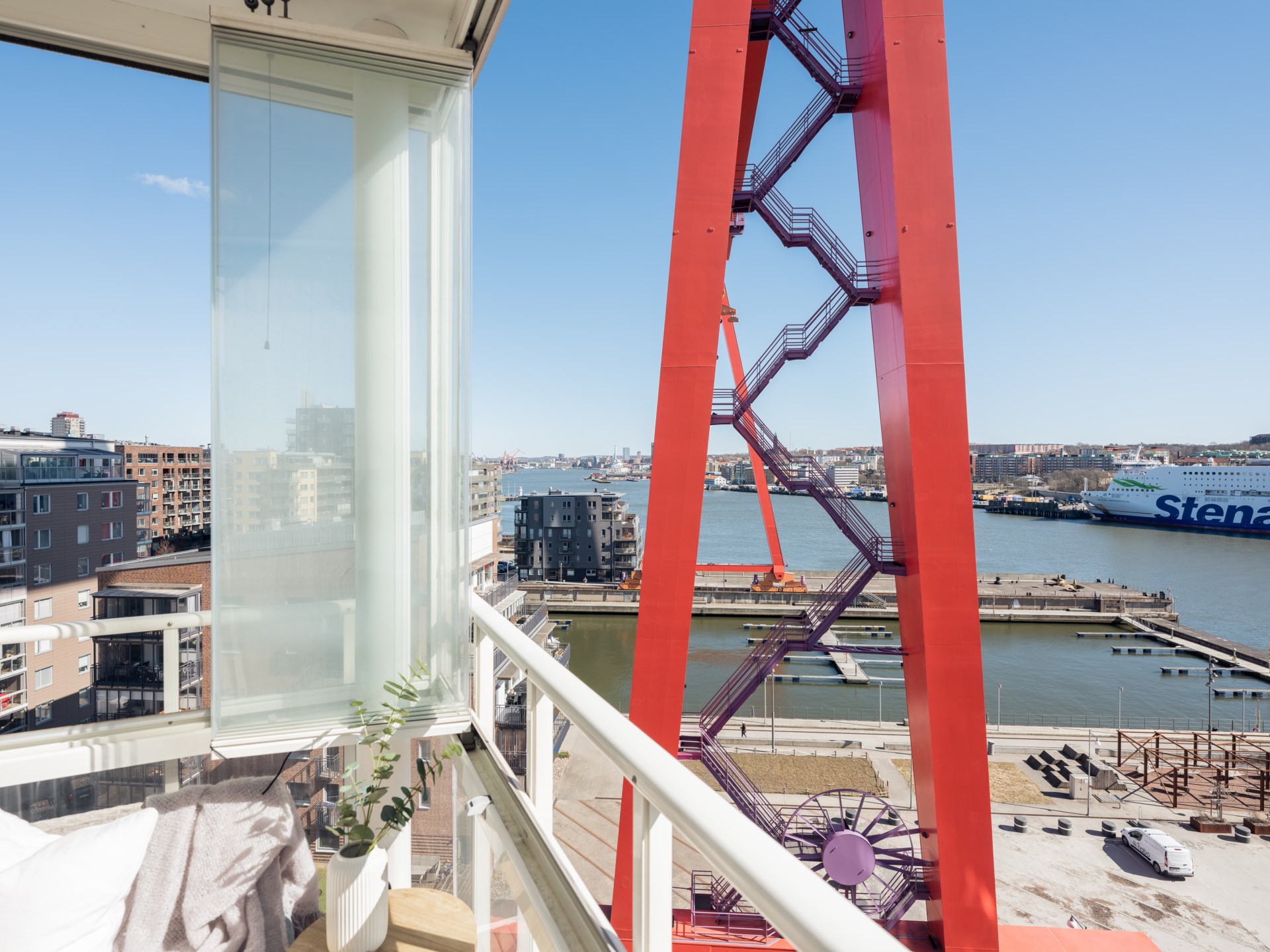 Välkomna till en generös och insynsskyddad hörntrea högt upp på våning 9, ett hem som bjuder på ljus, rymd och en utsikt som få kan njuta av. Här bor ni med första parkett mot hamninloppet och Göteborgs siluett, där vyerna skiftar vackert från morgon till kväll och stadens liv blir en stämningsfull kuliss på avstånd att njuta från i din bostad.