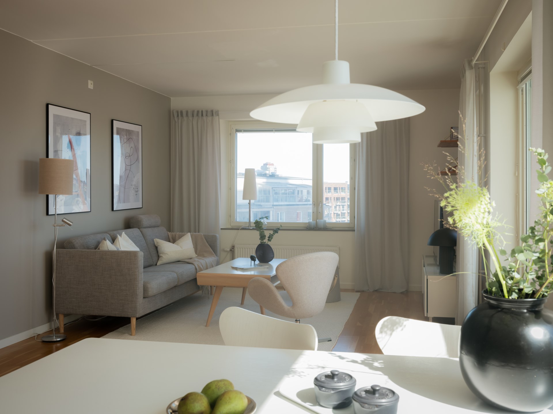 Den öppna och sociala planlösningen mellan kök och vardagsrum skapar en självklar samlingsplats med härlig rymd och fint ljusinsläpp från flera väderstreck. Bostaden erbjuder dessutom en extra toalett, vilket ger en smidig vardag och extra komfort när ni är flera hemma eller har gäster.Köket är stilrent och välplanerat med generösa arbetsytor och god förvaring. Genomtänkta förvaringsmöjligheter bidrar till en ordnad helhet och gör det enkelt att låta hemmet kännas lika luftigt som det ser ut.