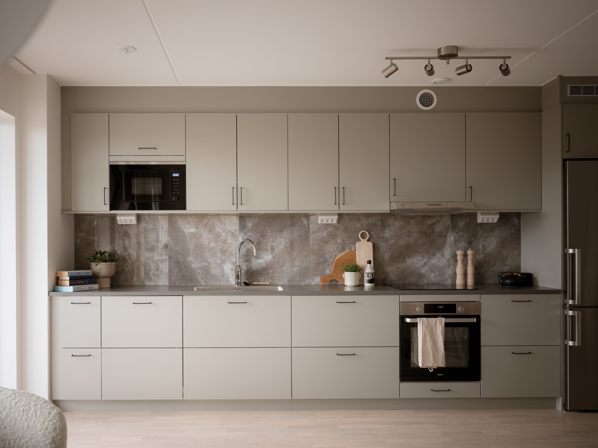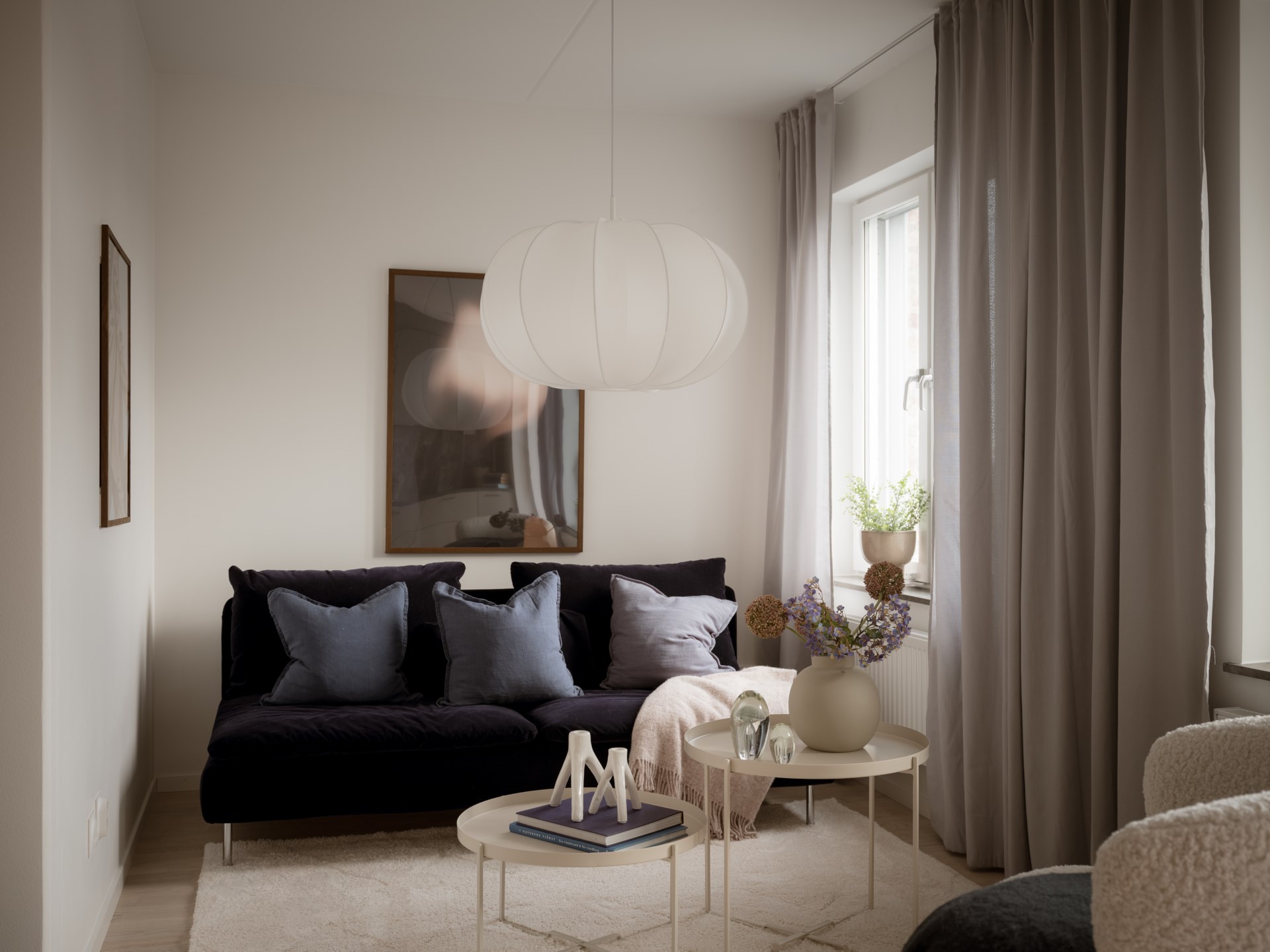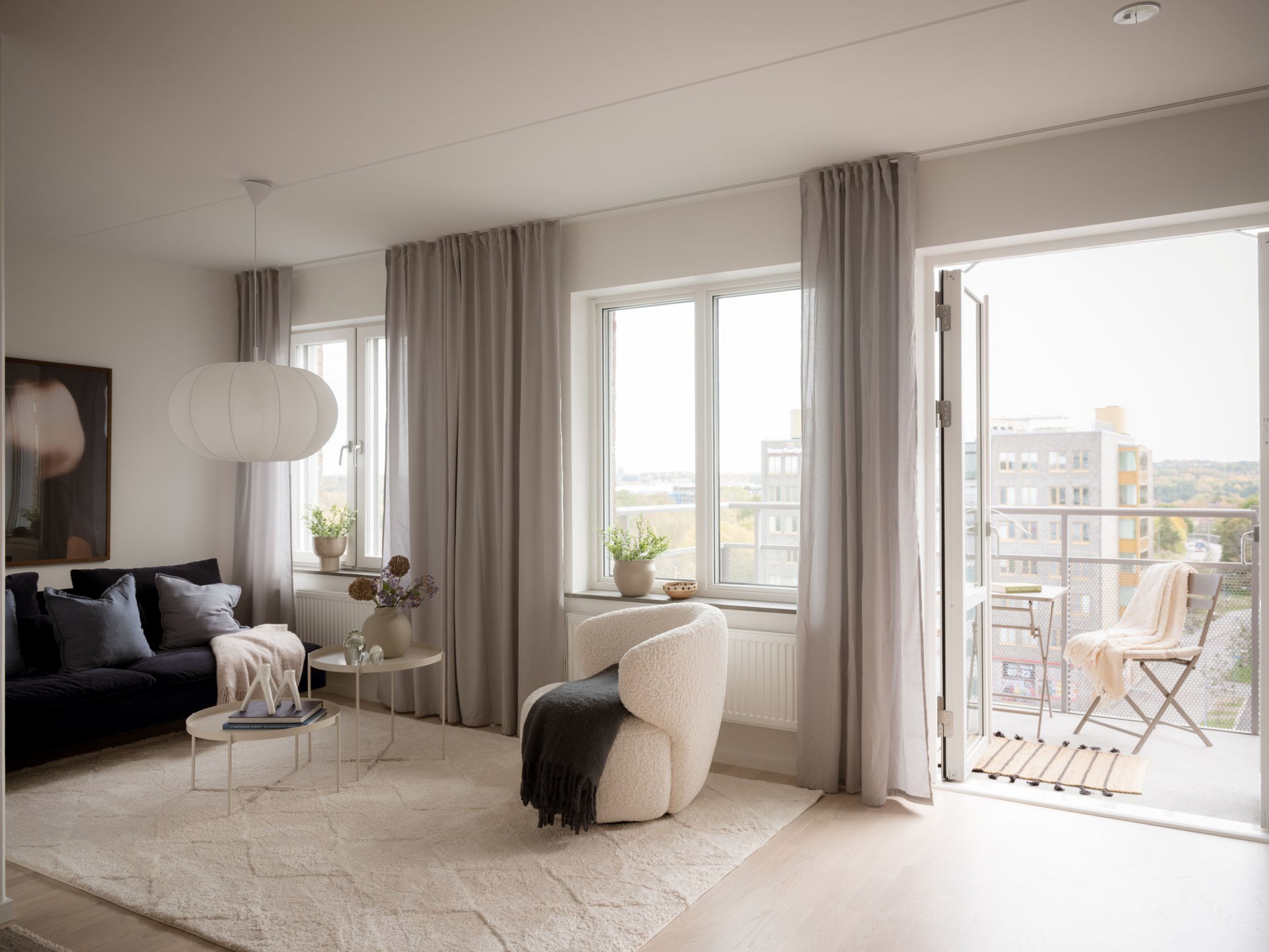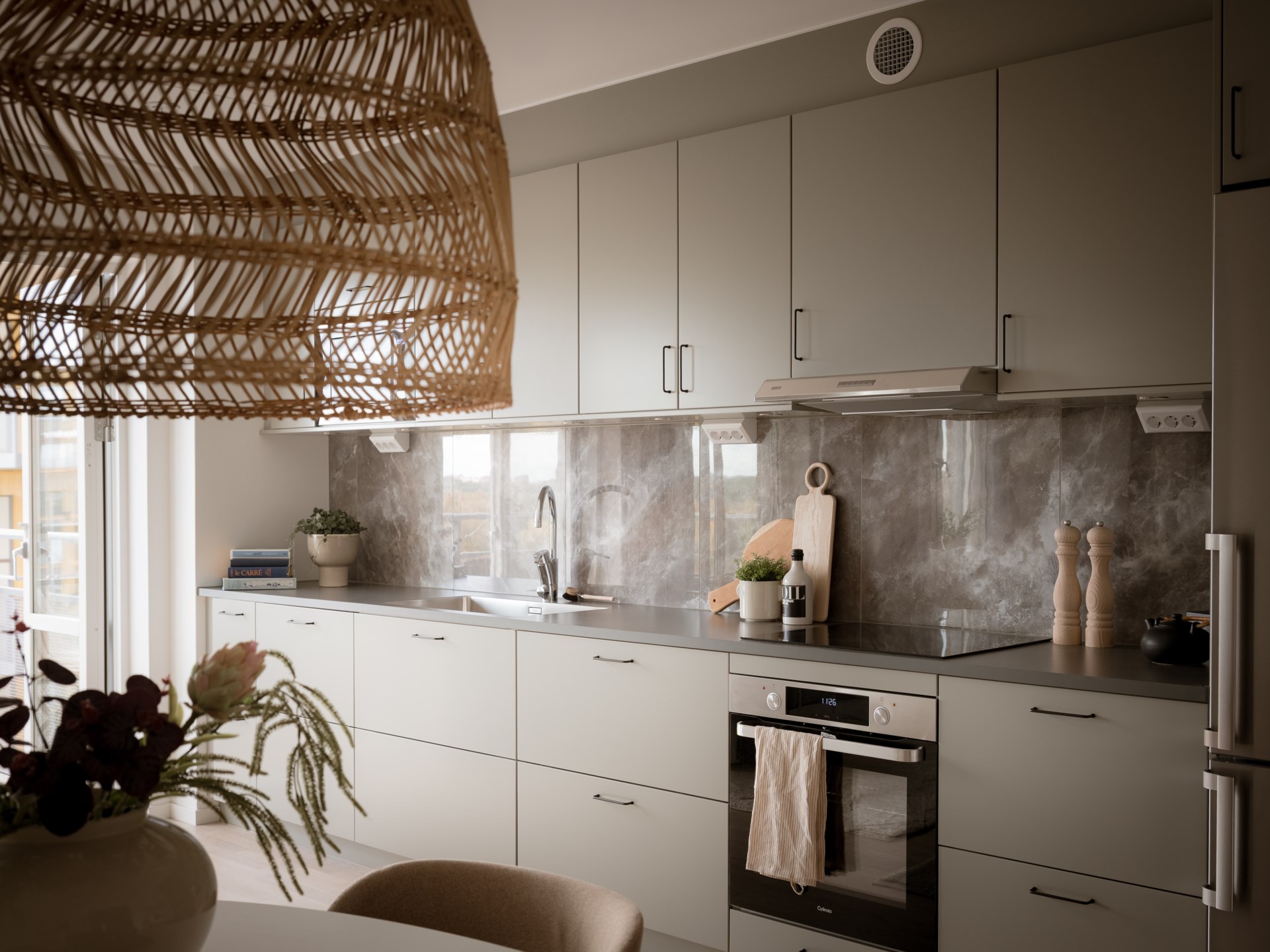 Bostaden har en trendig men samtidigt tidlös och hållbar inredning som alltid känns aktuell och ger hemmet en lugn och sober känsla. Grunden är neutral med vita väggar och ett ljust pigmenterat ekparkettgolv. Lägg därtill en behaglig gråskala som bryts av med detaljer i både svart och krom och du får ett modern boende som känns både elegant och stilsäkert. Du kan välja om du vill inreda trendigt med kontraster eller mjuka upp grunden med naturmaterial och en brunbeige färgskala. Den fasta inredningen kommer från kända varumärken som Ballingslöv, Svedbergs, Mora och Cylinda och du som flyttar in får hög kvalitet som håller under tid.