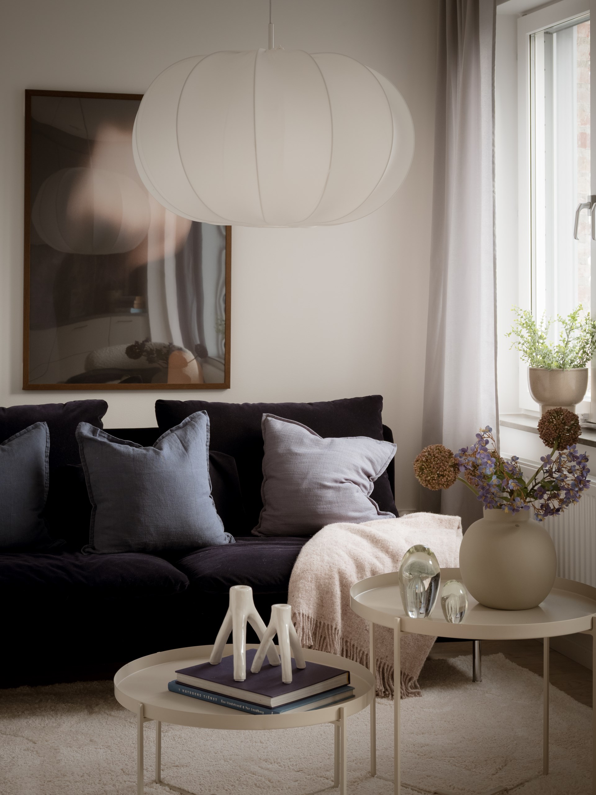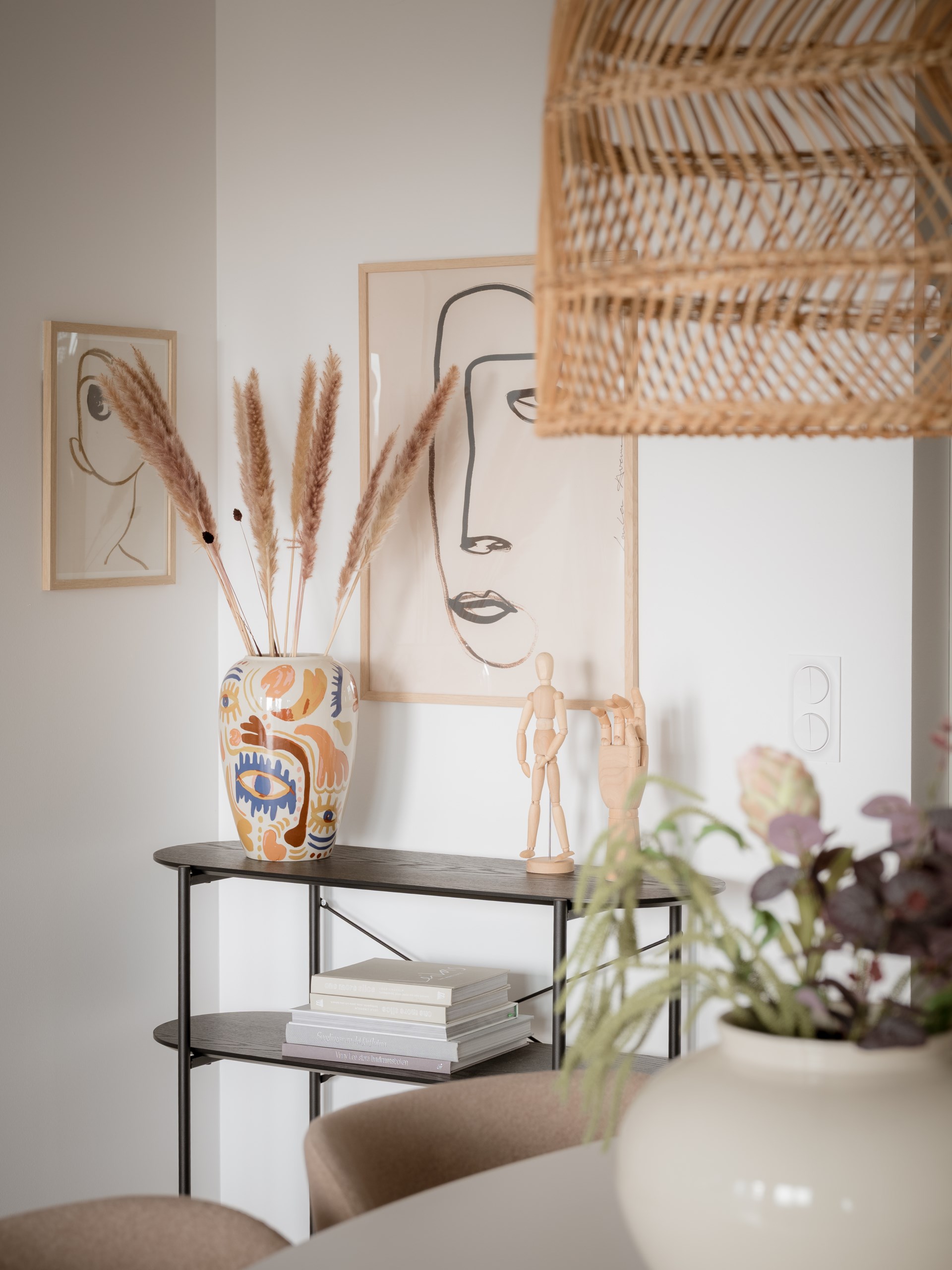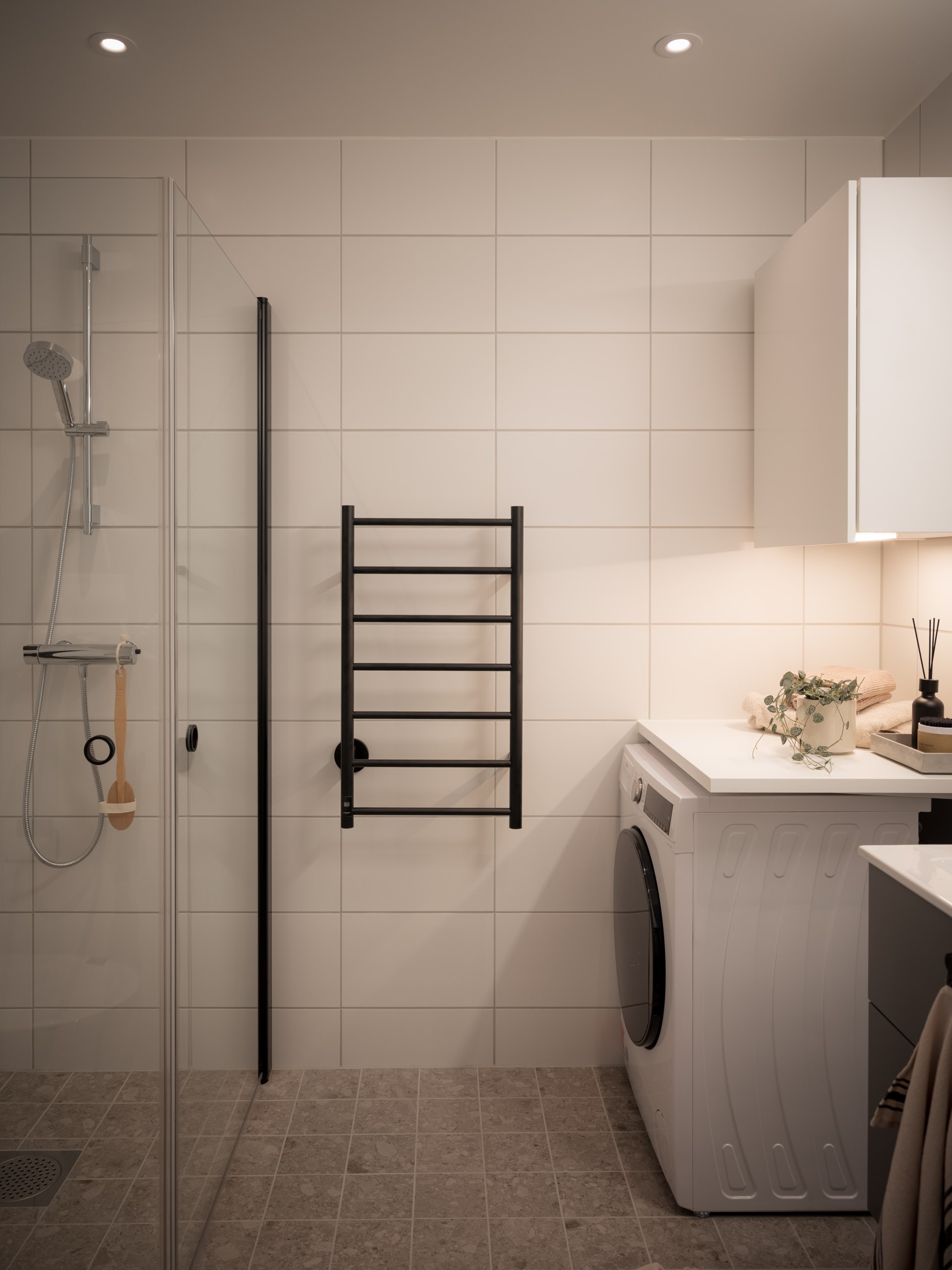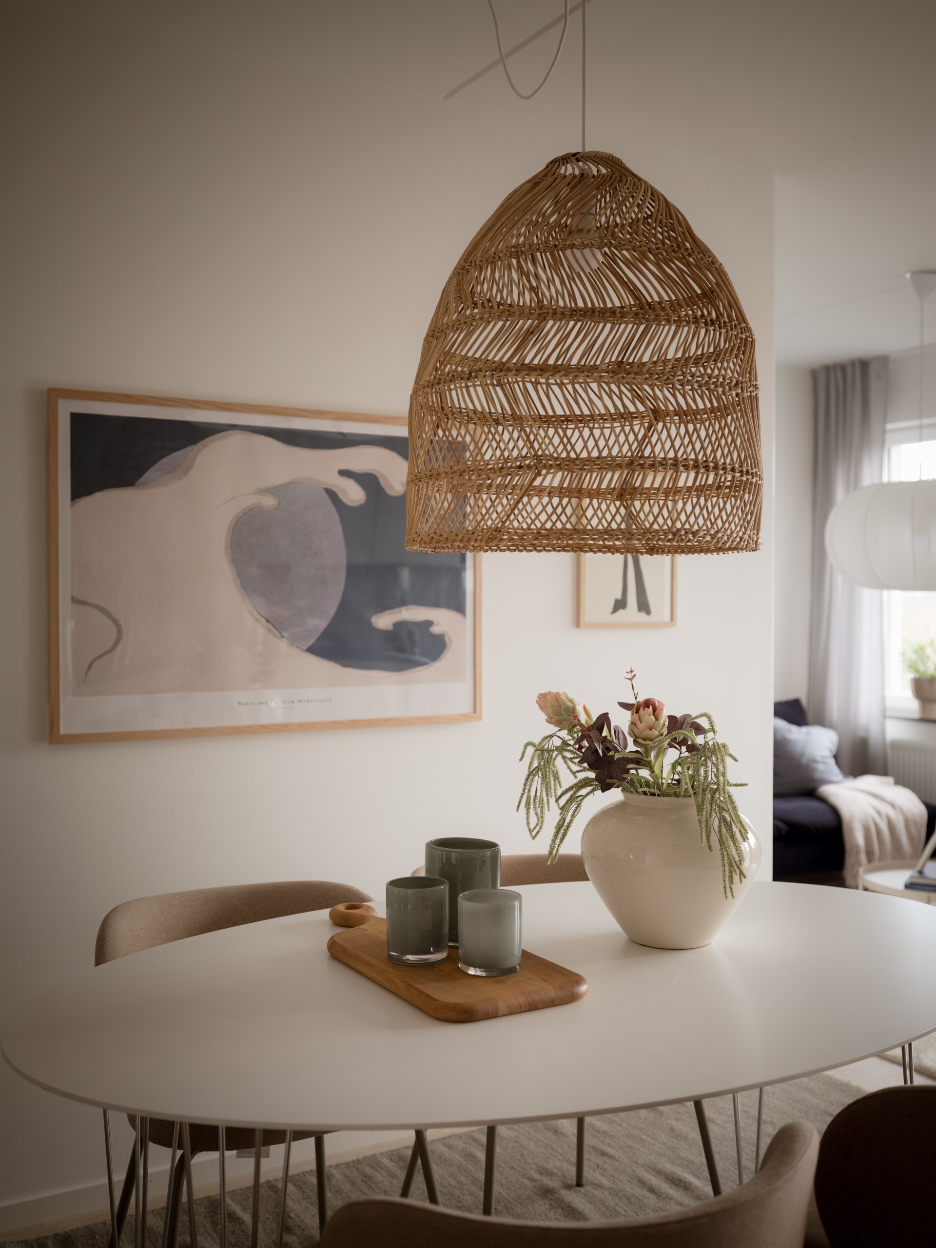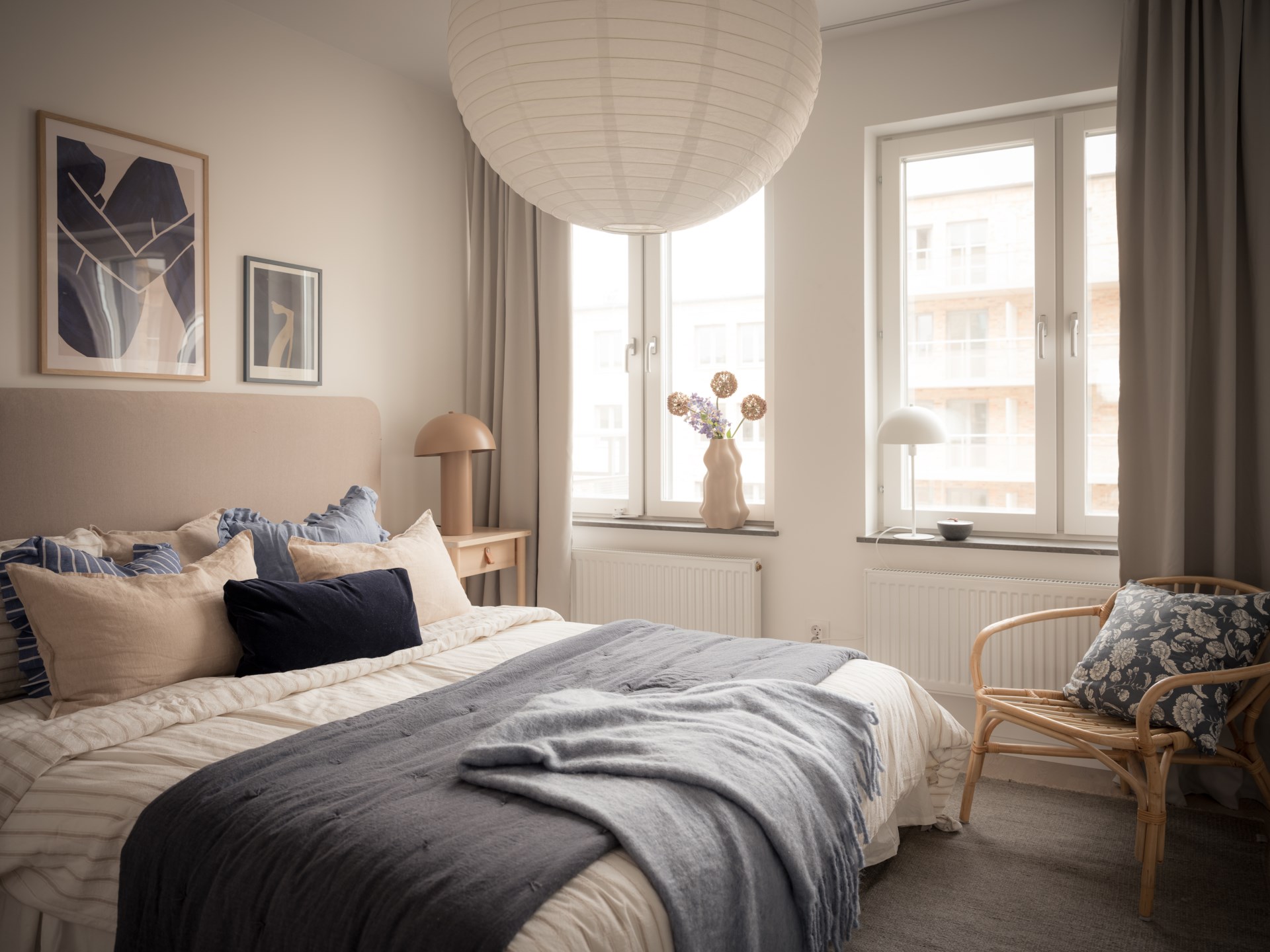 Bostaden har en trendig men samtidigt tidlös och hållbar inredning som alltid känns aktuell och ger hemmet en lugn och sober känsla. Grunden är neutral med vita väggar och ett ljust pigmenterat ekparkettgolv. Lägg därtill en behaglig gråskala som bryts av med detaljer i både svart och krom och du får ett modern boende som känns både elegant och stilsäkert. Du kan välja om du vill inreda trendigt med kontraster eller mjuka upp grunden med naturmaterial och en brunbeige färgskala. Den fasta inredningen kommer från kända varumärken som Ballingslöv, Svedbergs, Mora och Cylinda och du som flyttar in får hög kvalitet som håller under tid.
