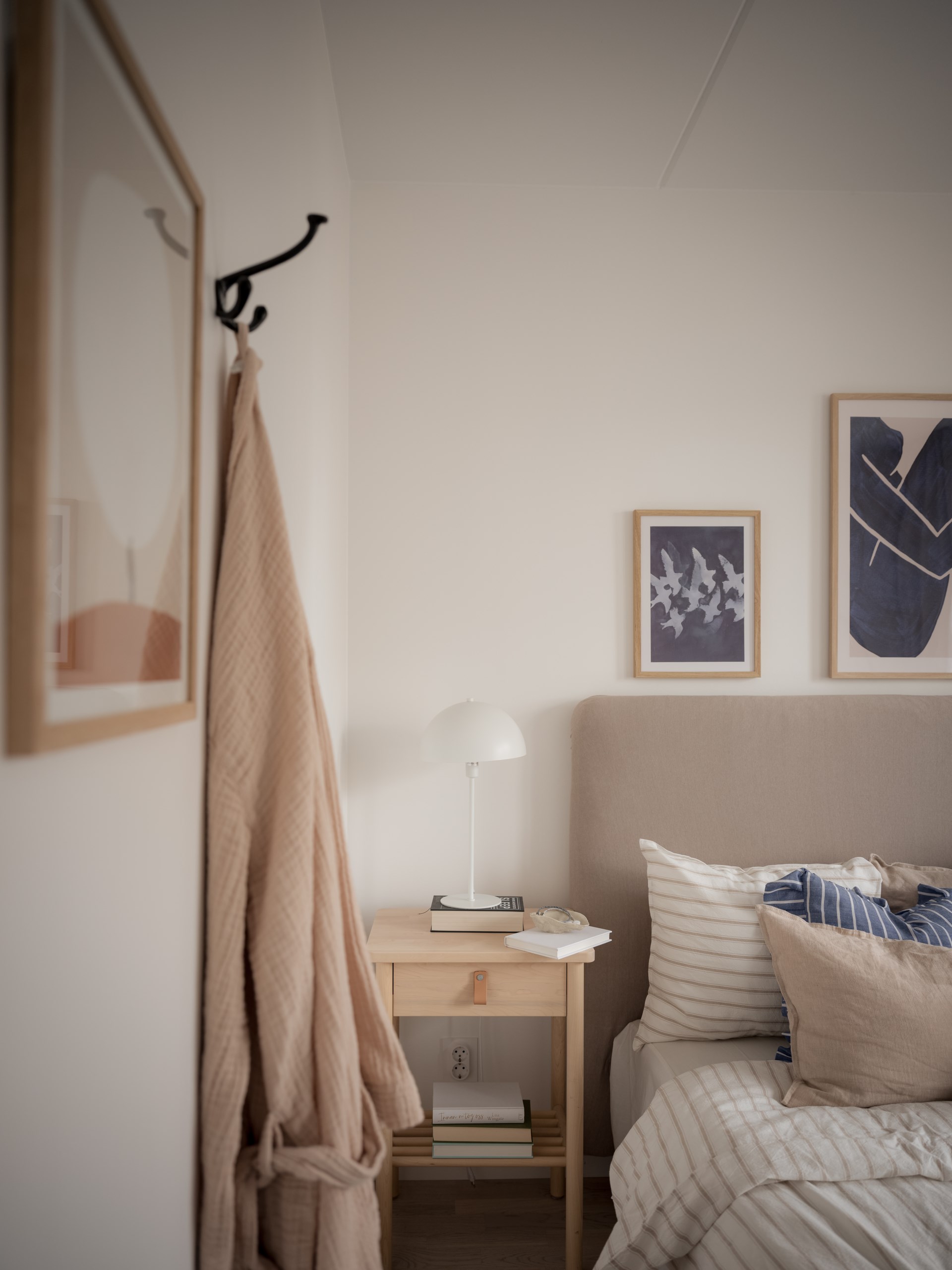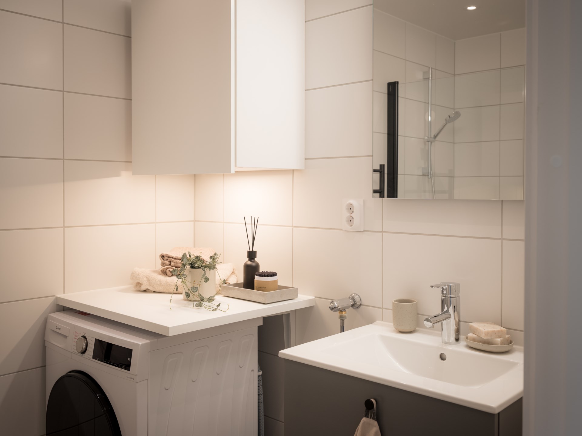 Det separata sovrummet är lugnt beläget och har alla förutsättningar för en avkopplande nattsömn. Bostaden erbjuder gott om förvaringsutrymme för att hålla hemmet organiserat och minimalistiskt, genom både skjutdörrsgarderob och förrådet som nås från hallen. Det helkaklade badrummet är stilrent och utrustat med duschhörna, toalett, kommod, belyst spegel och tvättdel med kombimaskin samt arbetsbänk och väggskåp för en enklare klädvård i vardagen.