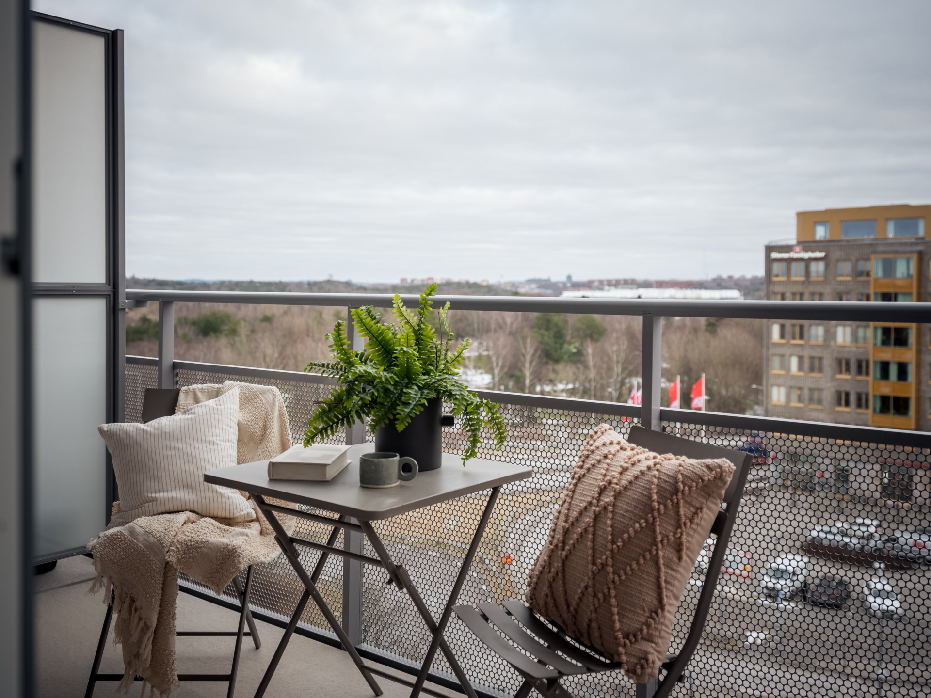 Genomtänkt och charmig etta om 33 kvm med högt läge och trevlig utsikt. Den smarta planeringen ger både bra med förvaringsutrymme i förrådet som döljs bakom skjutdörrar och kompletterande garderober, och en naturlig uppdelning mellan rummets olika funktioner. Det trendiga köket från Ballingslöv är en fröjd för den matlagningsintresserade, komplett med stilrena vitvaror från Cylinda.