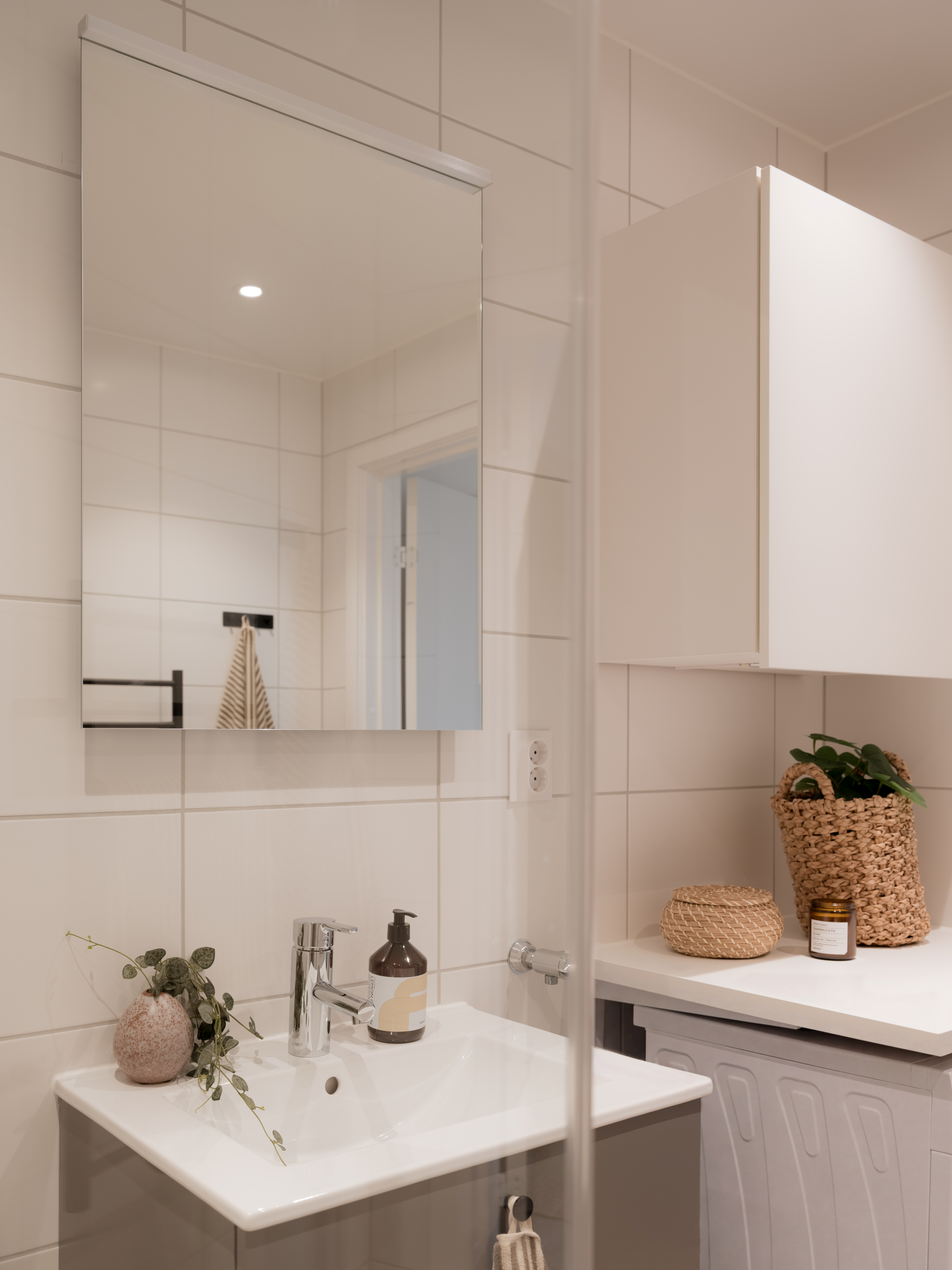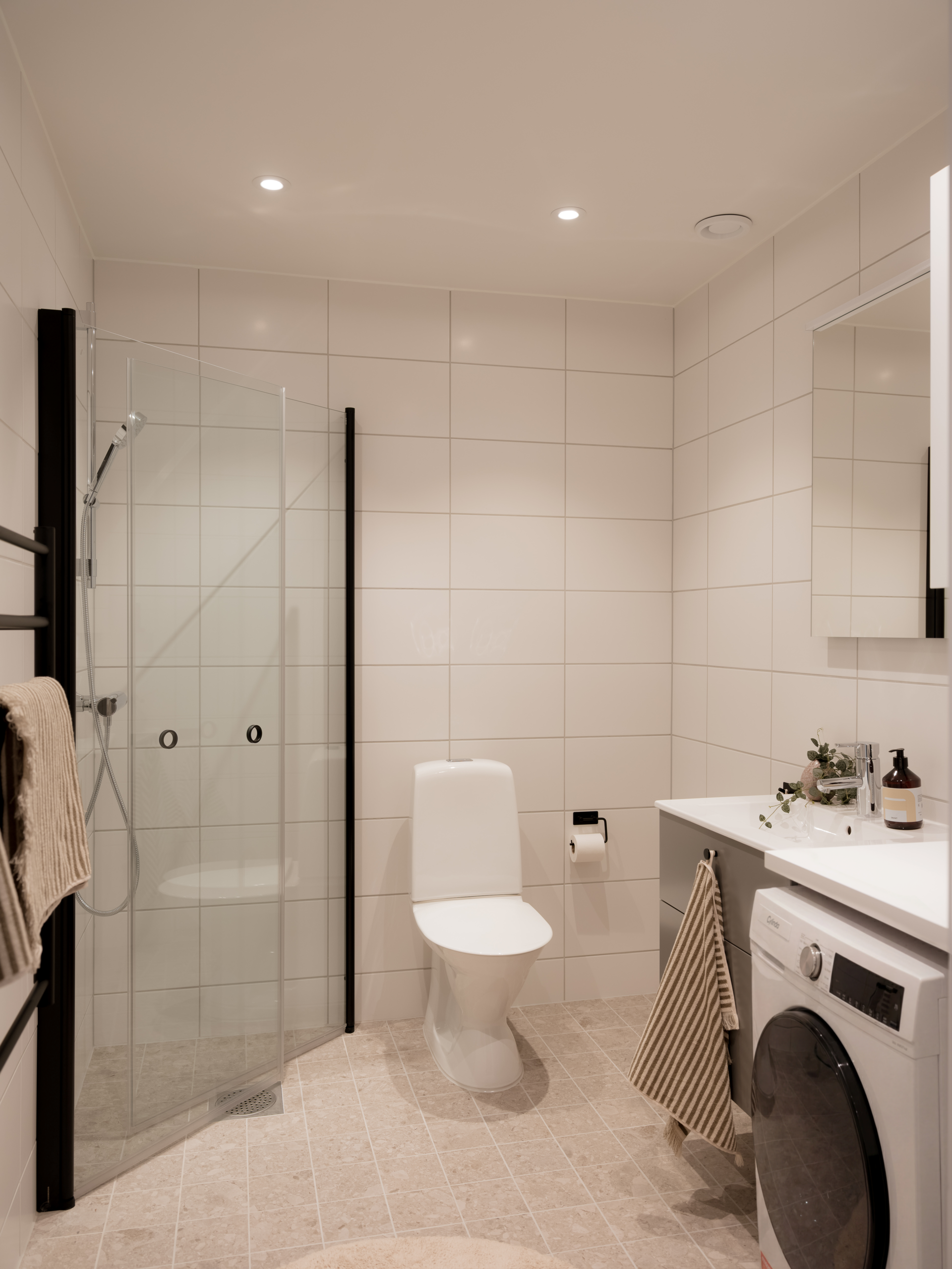 Det helkaklade badrummet är stilrent och utrustat med duschhörna, toalett, kommod, belyst spegel och kombimaskin samt arbetsbänk och väggskåp för en enklare klädvård i vardagen.