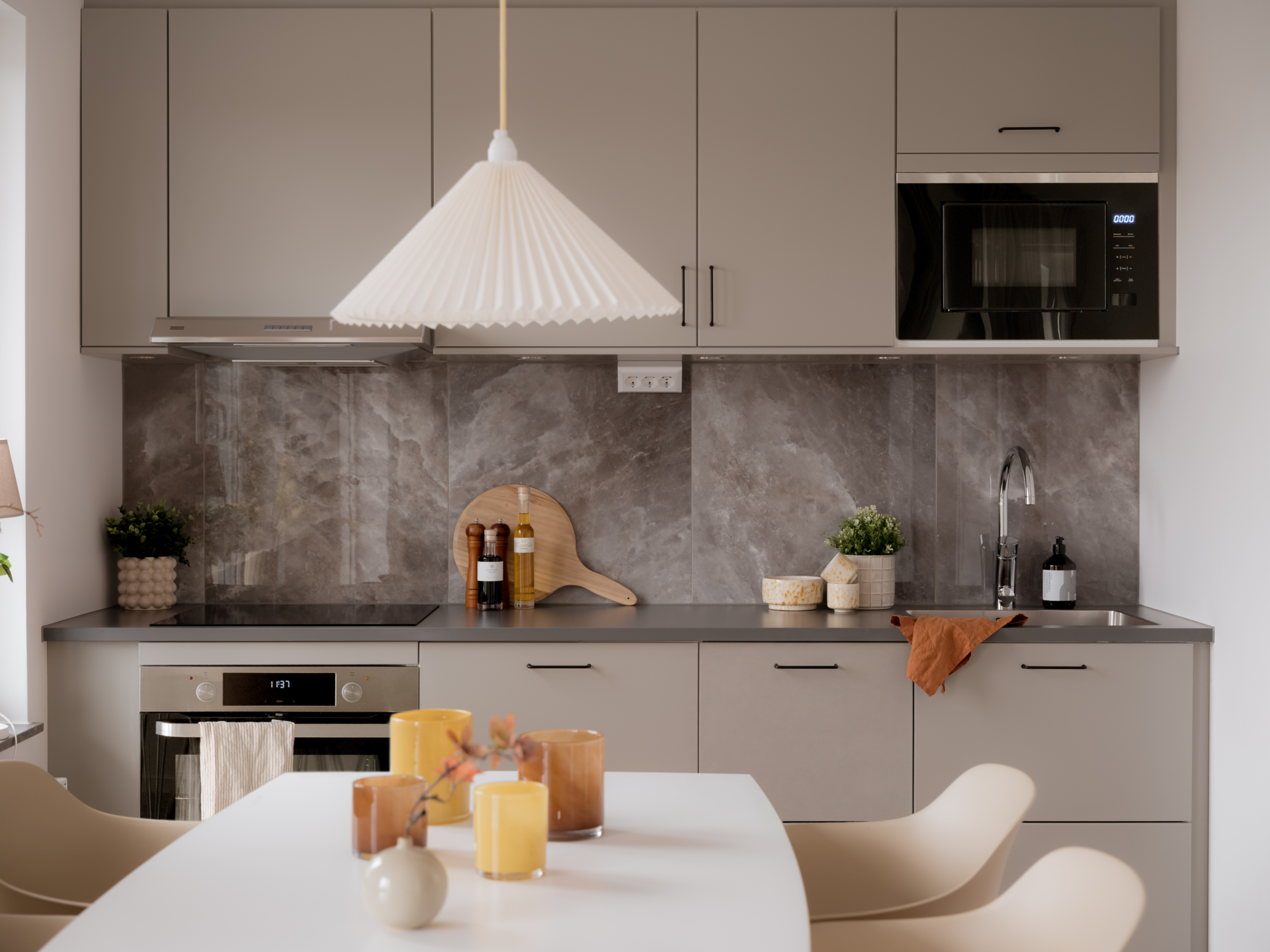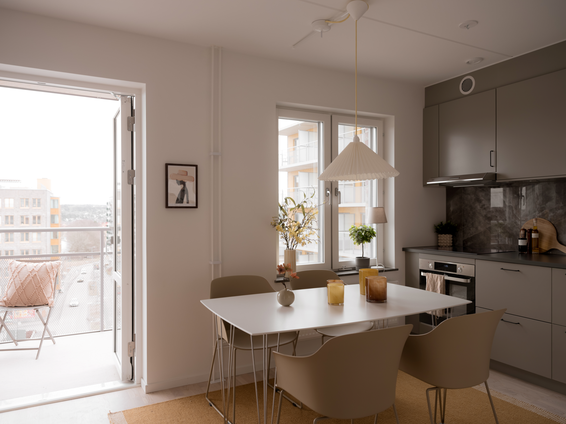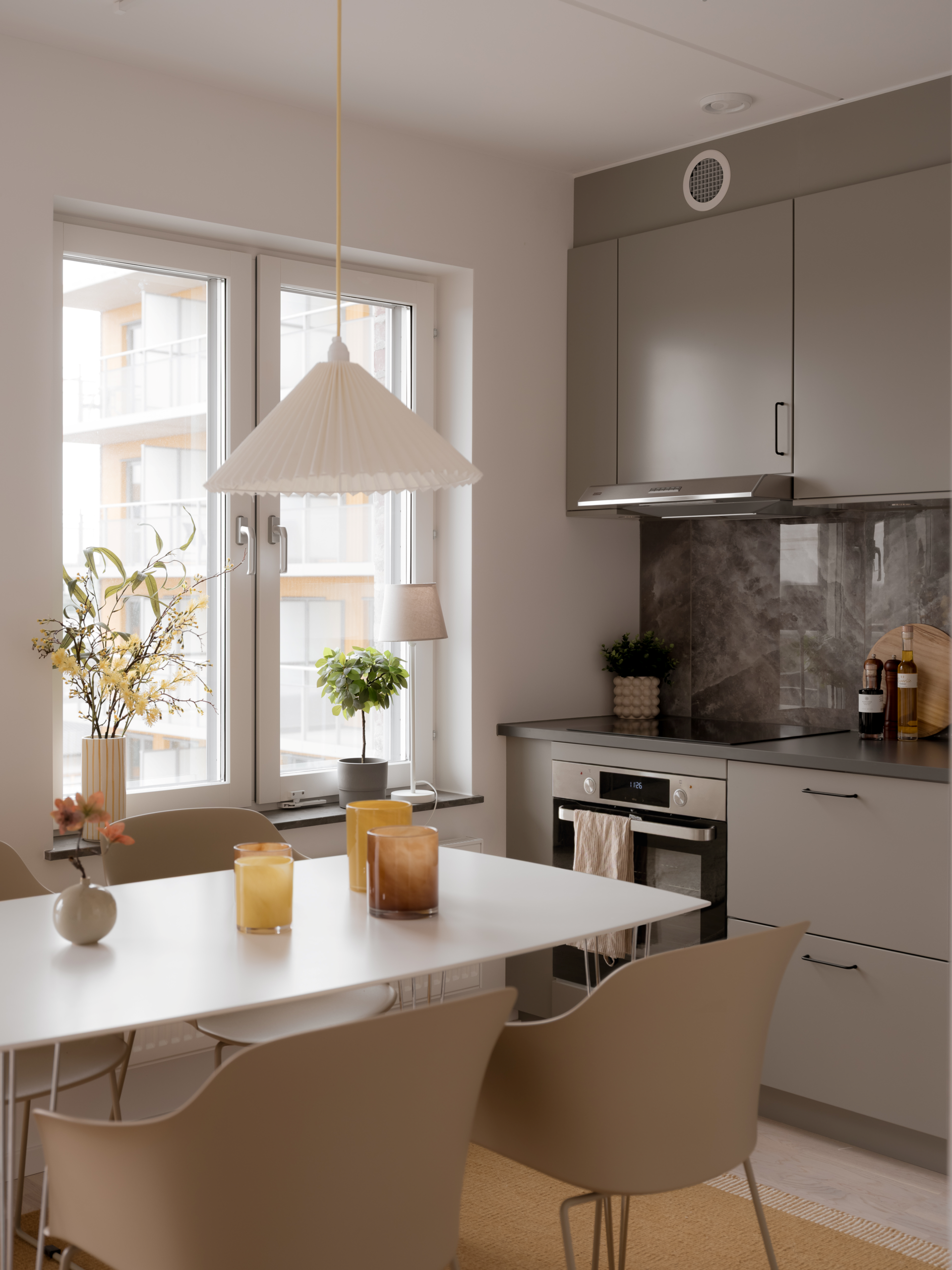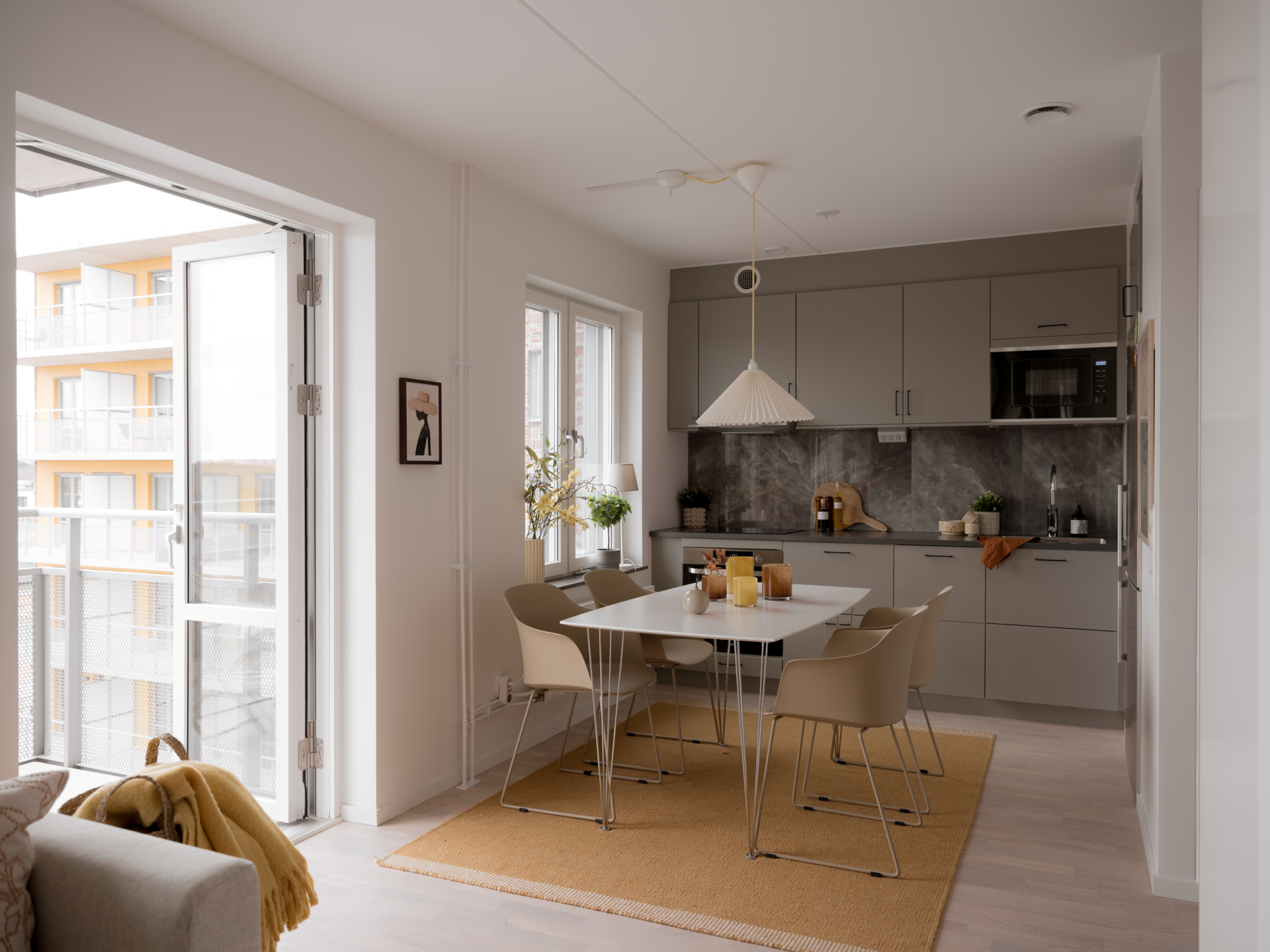 Bostaden har en trendig men samtidigt tidlös och hållbar inredning som alltid känns aktuell och ger hemmet en lugn och sober känsla. Grunden är neutral med vita väggar och ett ljust pigmenterat ekparkettgolv. Lägg därtill en behaglig gråskala som bryts av med detaljer i både svart och krom och du får ett modern boende som känns både elegant och stilsäkert. Du kan välja om du vill inreda trendigt med kontraster eller mjuka upp grunden med naturmaterial och en brunbeige färgskala. Den fasta inredningen kommer från kända varumärken som Ballingslöv, Svedbergs, Mora och Cylinda och du som flyttar in får hög kvalitet som håller under tid.