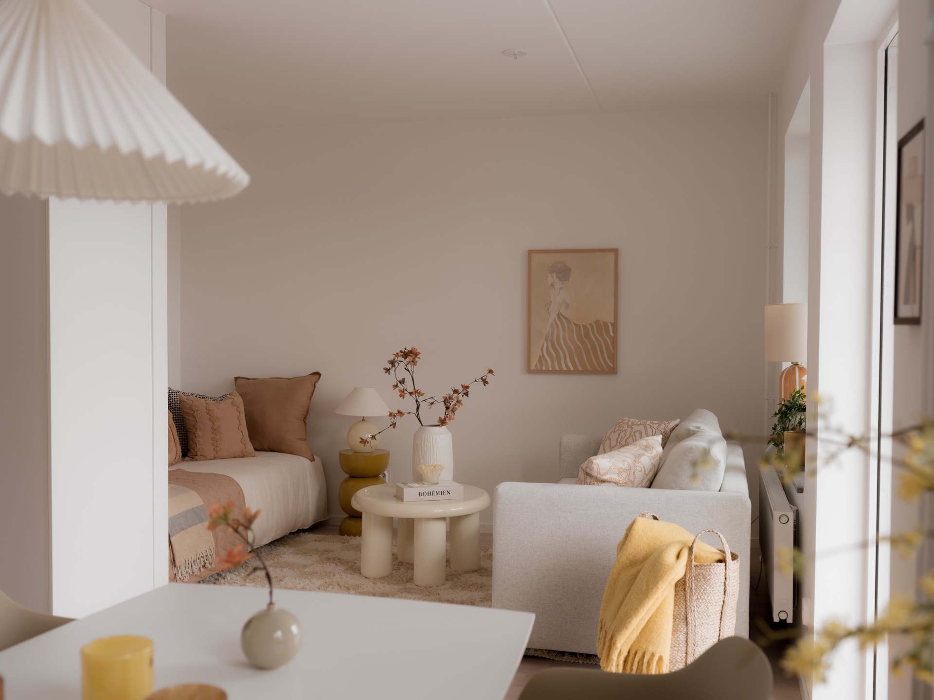 Utgången till balkongen blir den naturliga brytpunkten mellan kökets matplats och soffhörna. Soffhörnan kompletteras med ytor för sängmöbel, som kan separeras med textilier eller integreras som en del av umgängesytan.