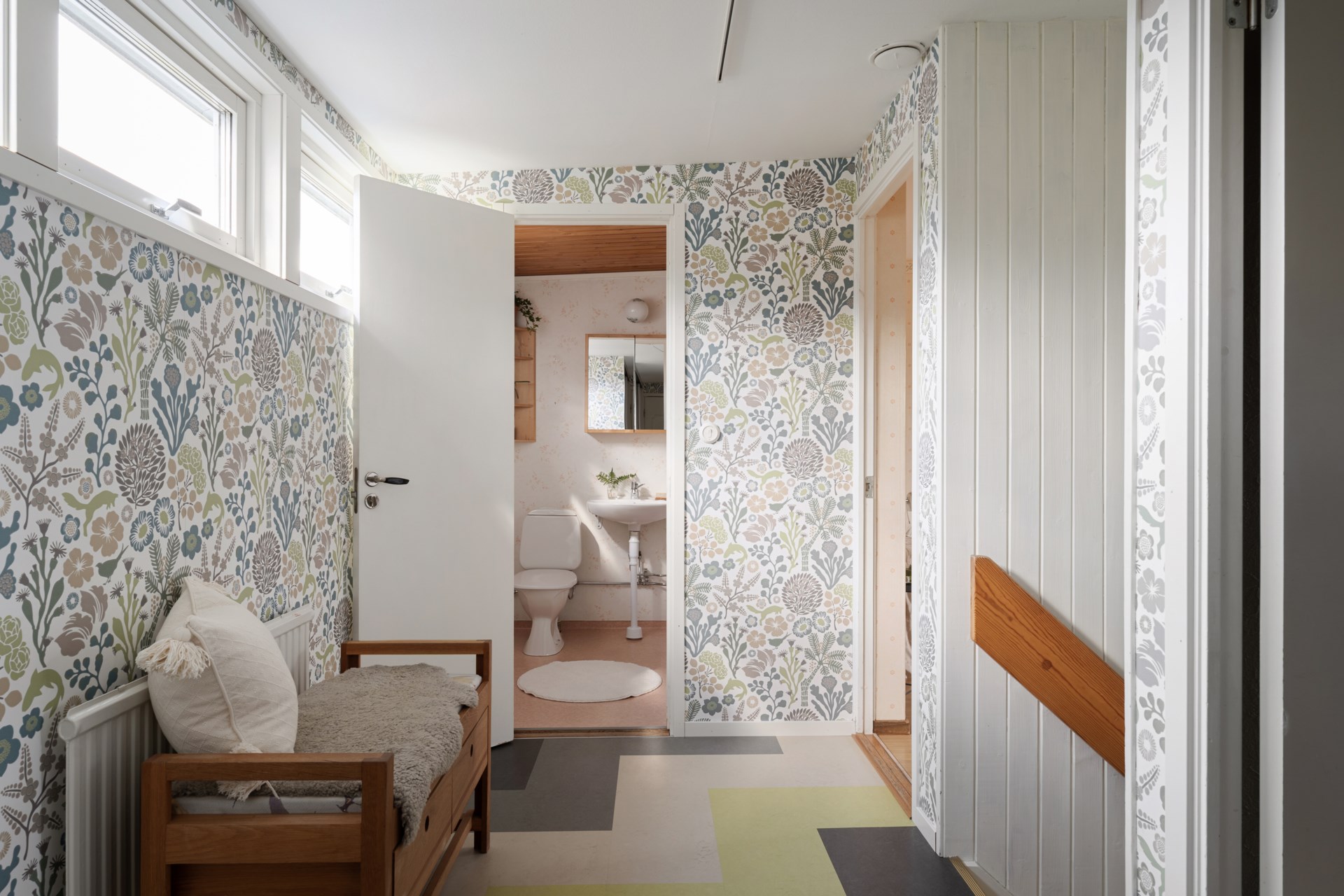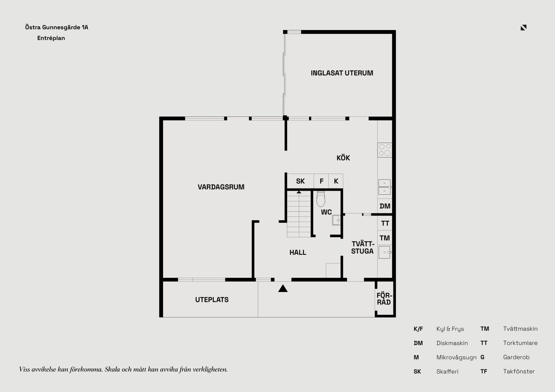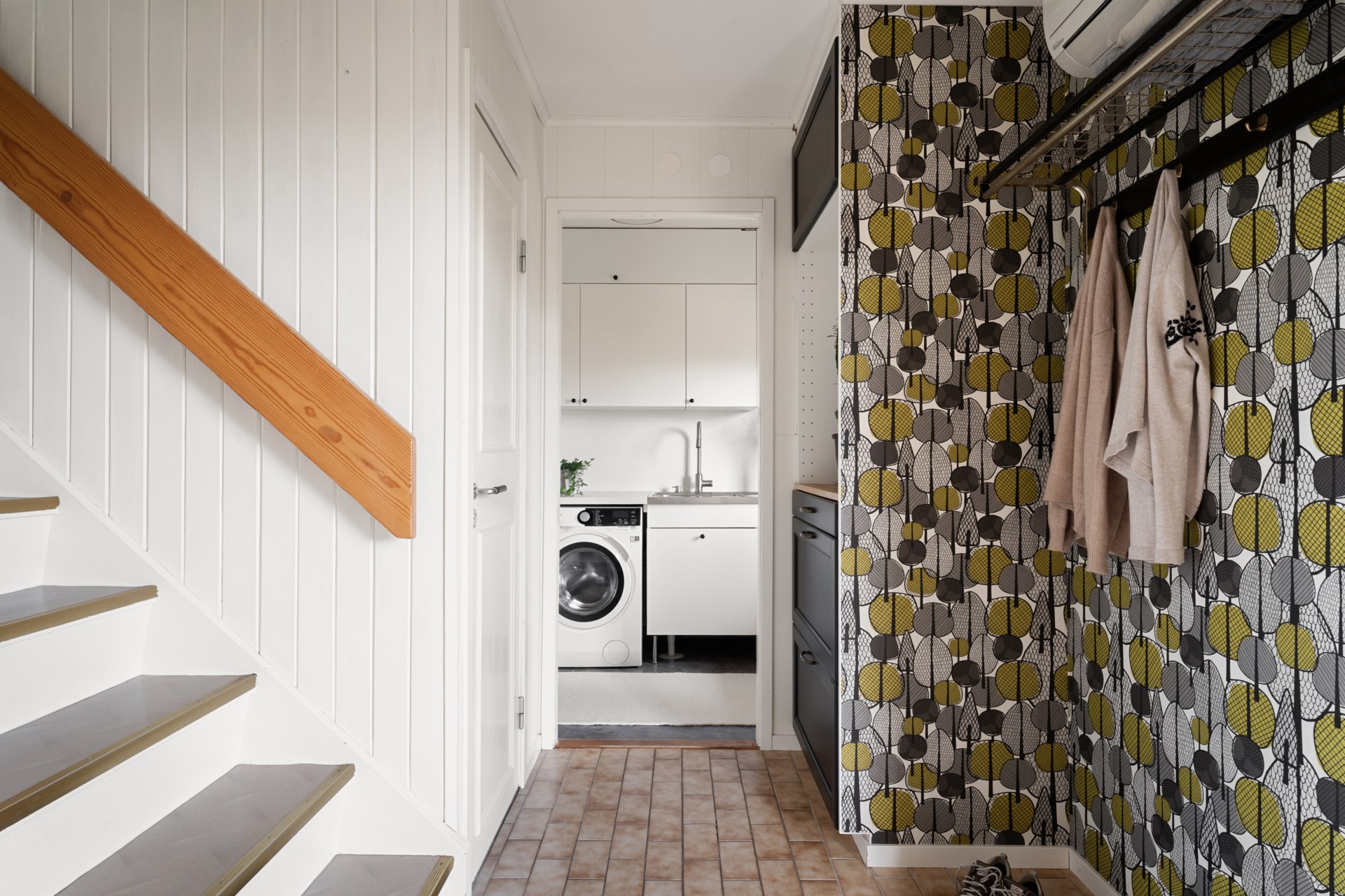 Redan på entréplanet märks den genomtänkta planlösningen. Här finns ett socialt vardagsrum med fina ytor för både soffhäng och middagar, och i anslutning ligger köket praktiskt placerat för att hålla ihop umgänget. Intill finns dessutom WC samt en separat tvättstuga som avlastar vardagen. Förvaringen är väl tilltagen med bland annat förråd i direkt anslutning och ytor som gör det lätt att hålla ordning.