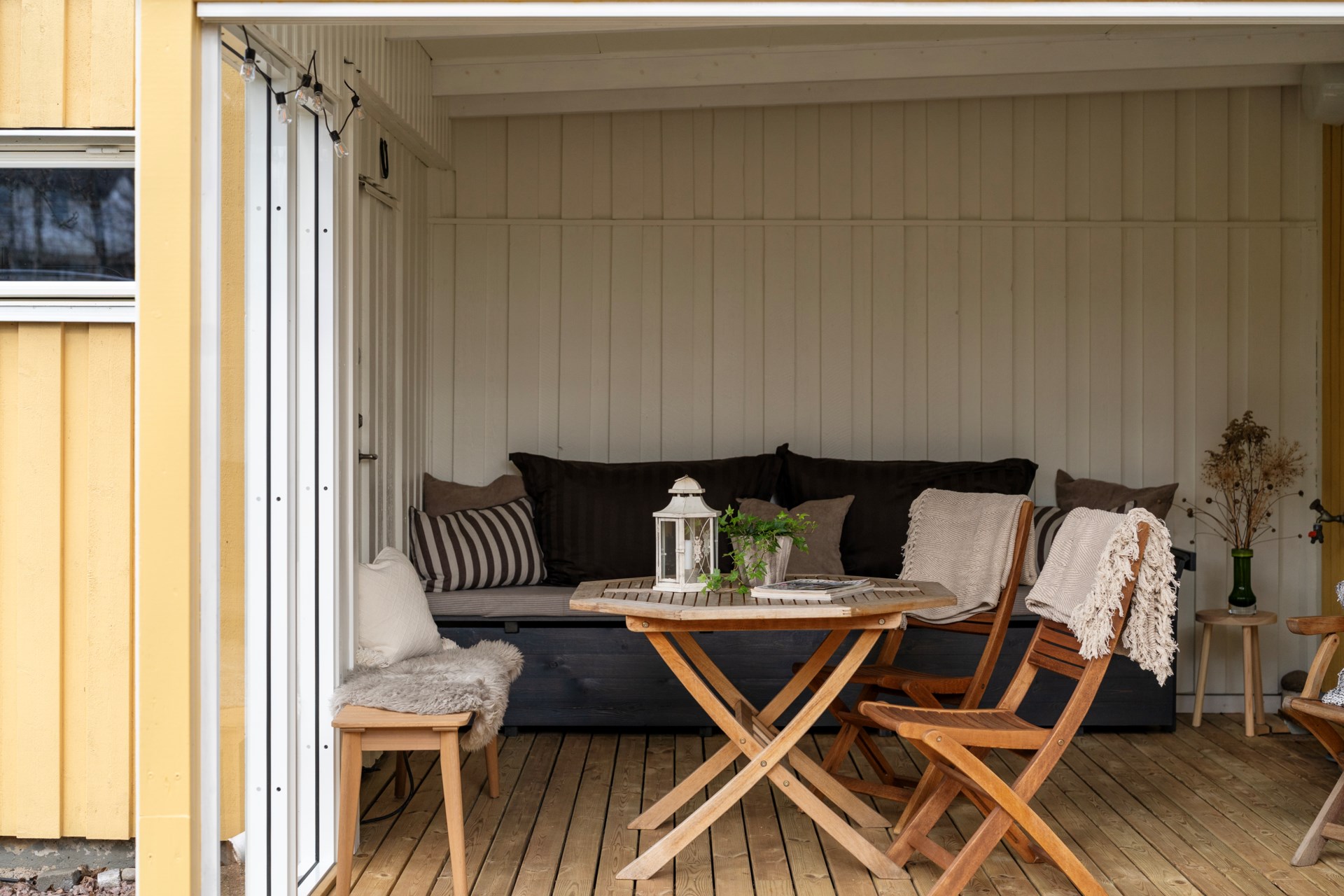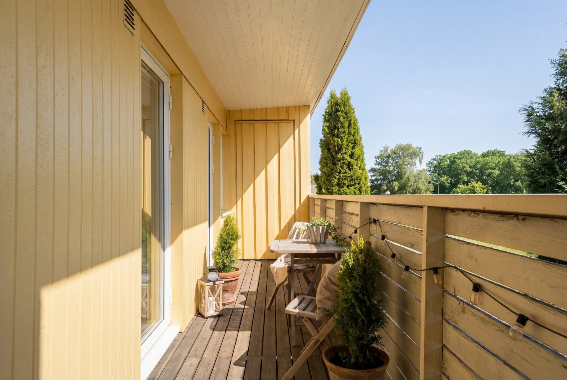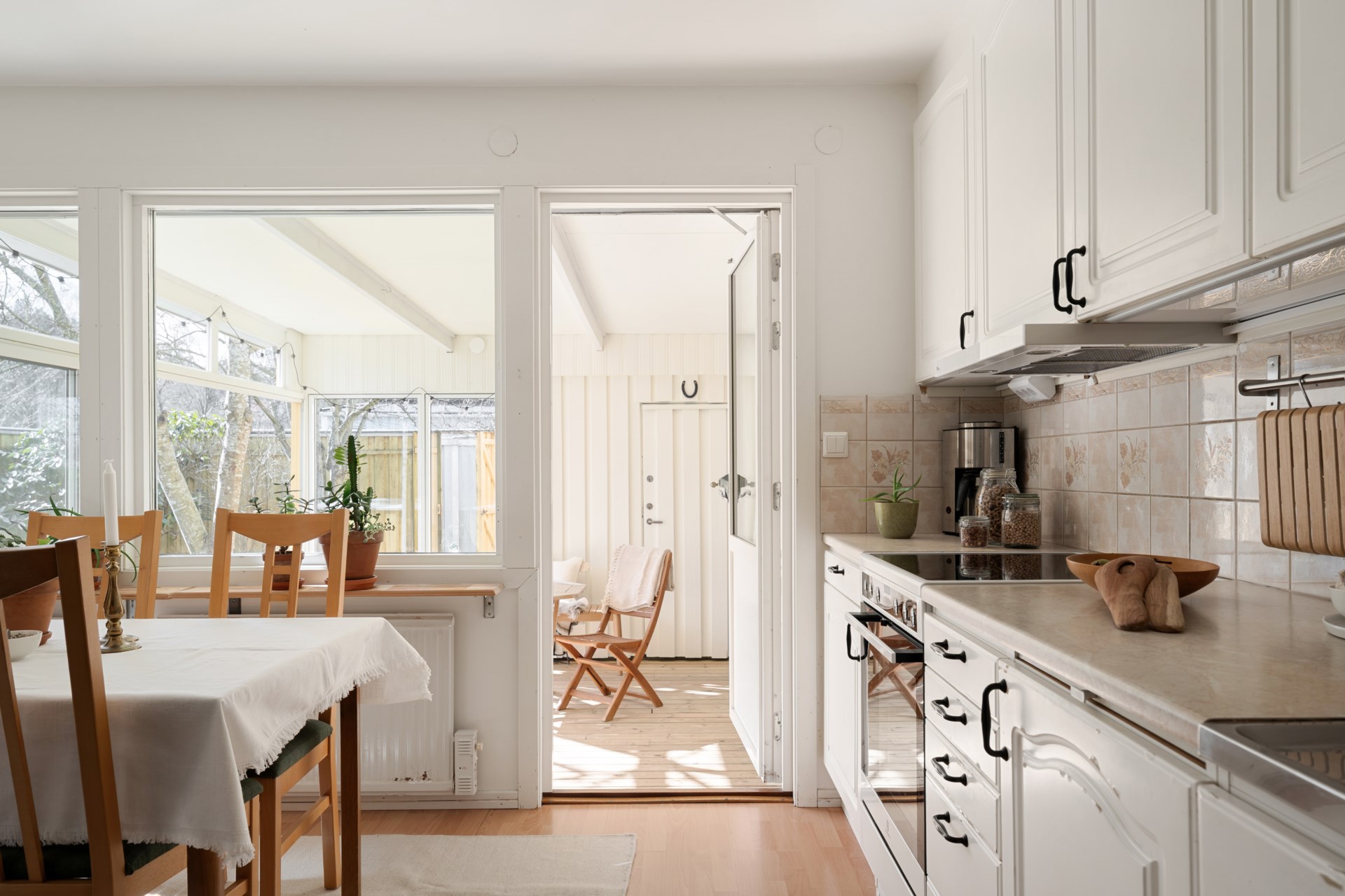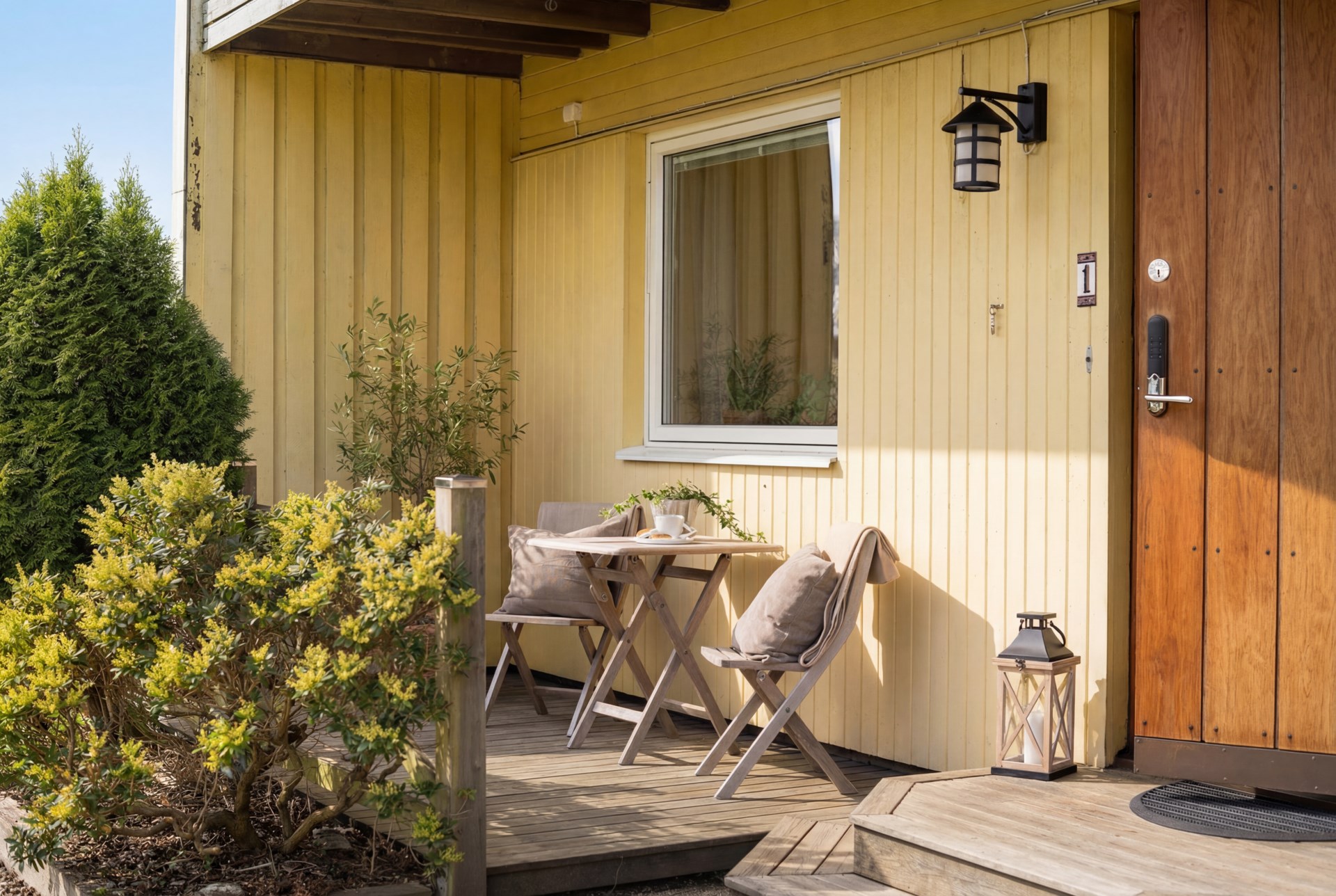 Hemmets naturliga favoritplats blir ofta det inglasade uterummet, ett sommaruterum som förlänger säsongen och suddar ut gränsen mellan inne och ute. Precis utanför väntar den lättskötta trädgården i västerläge, perfekt för eftermiddagssol, grillkvällar och en liten gräsyta att njuta av. Här finns även kallförråd för trädgårdsprylar. Som en extra bonus har huset en framsida med liten altan i morgonsol, en lugn plats för dagens första kopp.