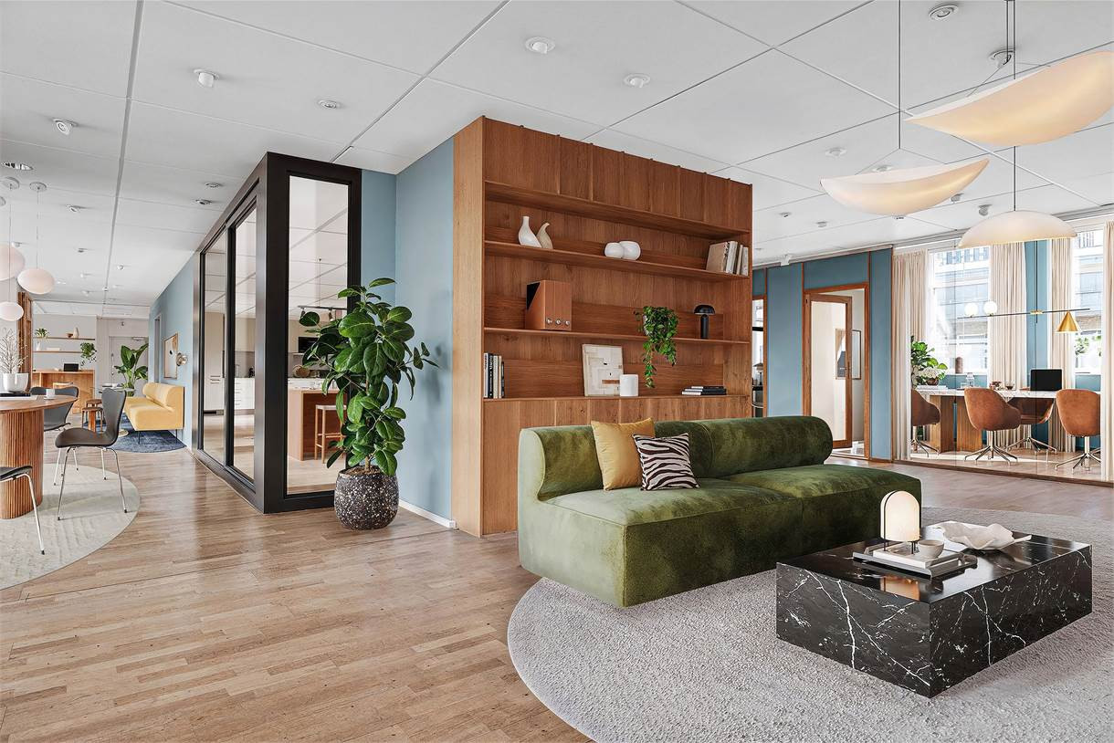 Lokalen har en genomtänkt planlösning med en blandning av kontorsytor, mötesrum i varierande storlekar och en rymlig social yta med pentry. Den centralt placerade pausyta skapar en naturlig samlingspunkt för medarbetare och bidrar till en levande arbetsplats där samarbete och kreativitet främjas.