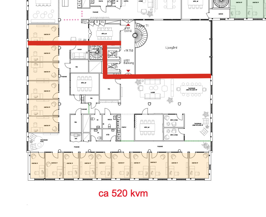 Nu erbjuds en mycket fin kontorslokal om 520 kvm i attraktivt läge vid Gårdatorget. Lokalen är i mycket gott skick och disponeras idag med en bra kombination av öppet kontorslandskap och flera enskilda kontor. Planlösningen skapar en effektiv arbetsmiljö med ytor för både samarbete och fokuserat arbete.